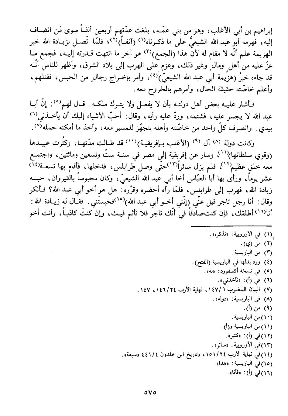 إِبْرَاهِيمَ بْنِ أَبِي الْأَغْلَبِ، وَهُوَ مِنْ بَنِي عَمِّهِ، بَلَغَتْ عِدَّتُهُمْ أَرْبَعِينَ أَلْفًا سِوَى مَنِ انْضَافَ إِلَيْهِ، فَهَزَمَهُ أَبُو عَبْدِ اللَّهِ الشِّيعِيُّ عَلَى مَا ذَكَرْنَاهُ (آنِفًا) ، فَلَمَّا اتَّصَلَ بِزِيَادَةِ اللَّهِ خَبَرُ الْهَزِيمَةِ عَلِمَ أَنَّهُ لَا مُقَامَ لَهُ لِأَنَّ هَذَا (الْجَمْعَ) هُوَ آخِرُ مَا انْتَهَتْ قُدْرَتُهُ إِلَيْهِ، فَجَمَعَ مَا عَزَّ عَلَيْهِ مِنْ أَهْلٍ وَمَالٍ وَغَيْرِ ذَلِكَ وَعَزَمَ عَلَى الْهَرَبِ إِلَى بِلَادِ الشَّرْقِ، وَأَظْهَرَ لِلنَّاسِ أَنَّهُ قَدْ جَاءَهُ خَبَرُ، (هَزِيمَةِ أَبِي عَبْدِ اللَّهِ الشِّيعِيِّ) ، وَأَمَرَ بِإِخْرَاجِ رِجَالٍ مِنَ الْحَبْسِ، فَقَتَلَهُمْ، وَأَعْلَمَ خَاصَّتَهُ حَقِيقَةَ الْحَالِ، وَأَمَرَهُمْ بِالْخُرُوجِ مَعَهُ.