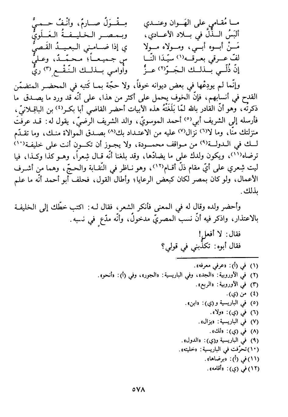 وَإِنَّمَا لَمْ يُودِعْهَا فِي بَعْضِ دِيوَانِهِ خَوْفًا، وَلَا حُجَّةَ بِمَا كَتَبَهُ فِي الْمَحْضَرِ الْمُتَضَمِّنِ الْقَدْحَ فِي أَنْسَابِهِمْ، فَإِنَّ الْخَوْفَ يَحْمِلُ عَلَى أَكْثَرَ مِنْ هَذَا، عَلَى أَنَّهُ قَدْ وَرَدَ مَا يُصَدِّقُ مَا ذَكَرْتُهُ، وَهُوَ أَنَّ الْقَادِرَ بِاللَّهِ لَمَّا بَلَغَتْهُ هَذِهِ الْأَبْيَاتُ أَحْضَرَ الْقَاضِيَ أَبَا بَكْرِ بْنَ الْبَاقِلَّانِيِّ، فَأَرْسَلَهُ إِلَى الشَّرِيفِ أَبِي أَحْمَدَ الْمُوسَوِيِّ وَالِدِ الشَّرِيفِ الرَّضِيِّ، يَقُولُ لَهُ: قَدْ عَرَفْتَ مَنْزِلَتَكَ مِنَّا، وَمَا لَا نَزَالُ عَلَيْهِ مِنَ الِاعْتِدَادِ بِكَ بِصِدْقِ الْمُوَالَاةِ مِنْكَ، وَمَا تَقَدَّمَ لَكَ فِي الدَّوْلَةِ مِنْ مَوَاقِفَ مَحْمُودَةٍ، وَلَا يَجُوزُ أَنْ تَكُونَ أَنْتَ عَلَى خَلِيفَةٍ تَرْضَاهُ، وَيَكُونَ وَلَدُكَ عَلَى مَا يُضَادُّهَا، وَقَدْ بَلَغَنَا أَنَّهُ قَالَ شِعْرًا، وَهُوَ كَذَا وَكَذَا، فَيَا لَيْتَ شِعْرِي عَلَى أَيِّ مُقَامِ ذُلٍّ أَقَامَ، وَهُوَ نَاظِرٌ فِي النِّقَابَةِ وَالْحَجِّ، وَهُمَا مِنْ أَشْرَفِ الْأَعْمَالِ، وَلَوْ كَانَ بِمِصْرَ لَكَانَ كَبَعْضِ الرَّعَايَا، وَأَطَالَ الْقَوْلَ، فَحَلَفَ أَبُو أَحْمَدَ أَنَّهُ مَا عَلِمَ بِذَلِكَ.