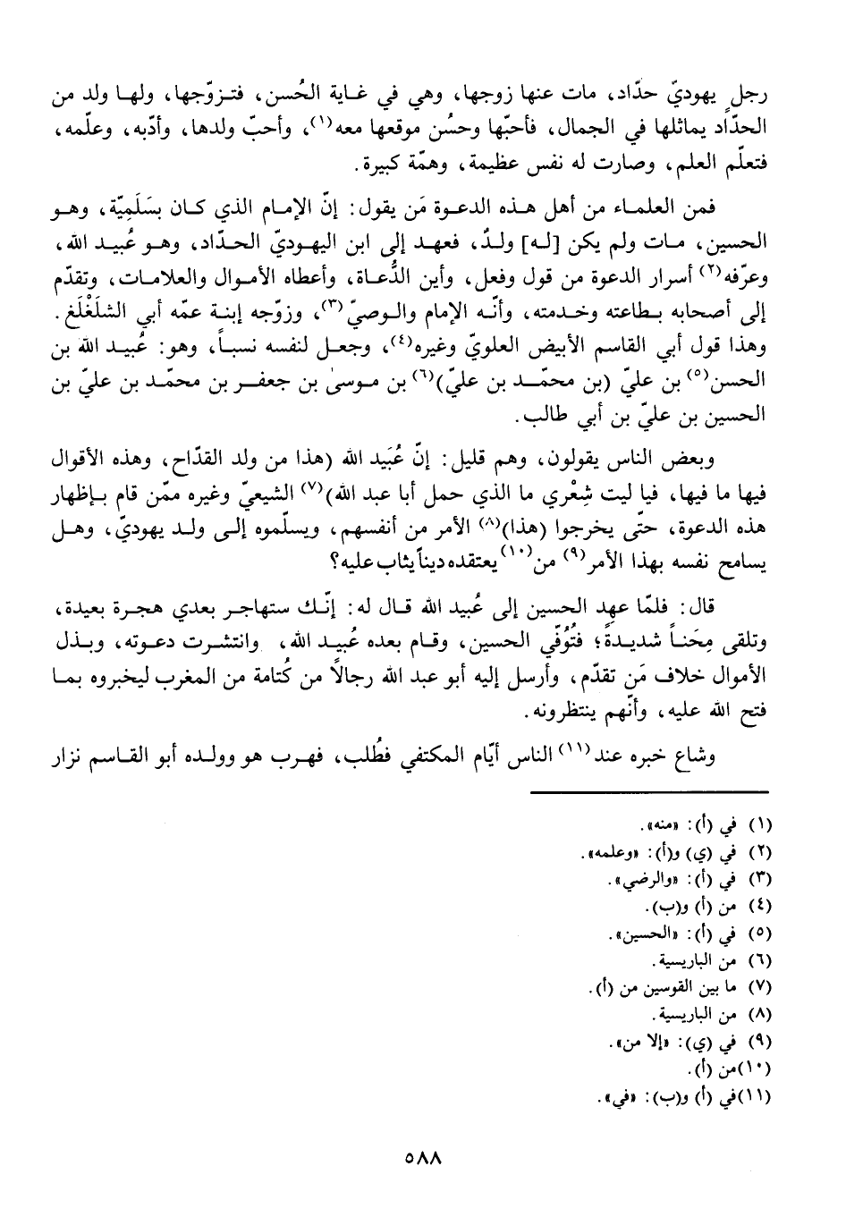 وَبَعْضُ النَّاسِ يَقُولُونَ، وَهُمْ قَلِيلٌ: إِنَّ عُبَيْدَ اللَّهِ (هَذَا مِنْ وَلَدِ الْقَدَّاحِ، وَهَذِهِ الْأَقْوَالُ فِيهَا مَا فِيهَا، فَيَا لَيْتَ شِعْرِي مَا الَّذِي حَمَلَ أَبَا عَبْدِ اللَّهِ) الشِّيعِيَّ وَغَيْرَهُ مِمَّنْ قَامَ بِإِظْهَارِ هَذِهِ الدَّعْوَةِ، حَتَّى يُخْرِجُوا (هَذَا) الْأَمْرَ مِنْ أَنْفُسِهِمْ، وَيُسَلِّمُوا إِلَى وَلَدِ يَهُودِيٍّ، وَهَلْ يُسَامِحُ نَفْسَهُ بِهَذَا الْأَمْرِ مَنْ يَعْتَقِدُهُ دِينًا يُثَابُ عَلَيْهِ؟