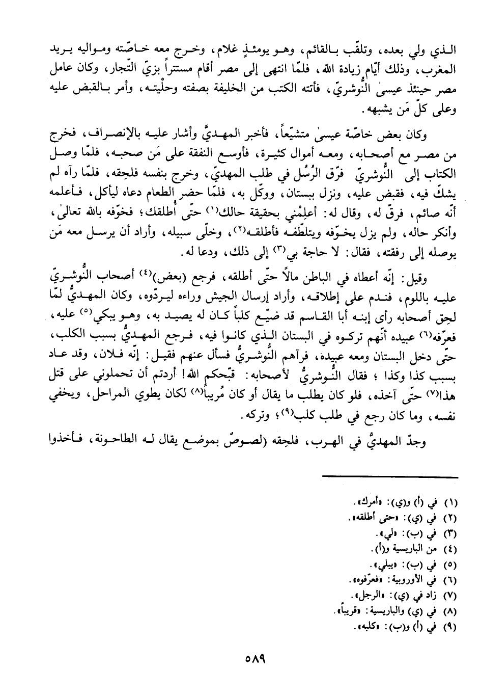 الَّذِي وَلِيَ بَعْدَهُ، وَتَلَقَّبَ بِالْقَائِمِ، وَهُوَ يَوْمَئِذٍ غُلَامٌ، وَخَرَجَ مَعَهُ خَاصَّتُهُ وَمَوَالِيهِ يُرِيدُ الْمَغْرِبَ، وَذَلِكَ أَيَّامَ زِيَادَةِ اللَّهِ، فَلَمَّا انْتَهَى إِلَى مِصْرَ أَقَامَ مُسْتَتِرًا بِزِيِّ التُّجَّارِ، وَكَانَ عَامِلَ مِصْرَ حِينَئِذٍ عِيسَى النُّوشَرِيُّ، فَأَتَتْهُ الْكُتُبُ مِنَ الْخَلِيفَةِ بِصِفَتِهِ وَحِلْيَتِهِ، وَأُمِرَ بِالْقَبْضِ عَلَيْهِ وَعَلَى كُلِّ مَنْ يُشْبِهُهُ.