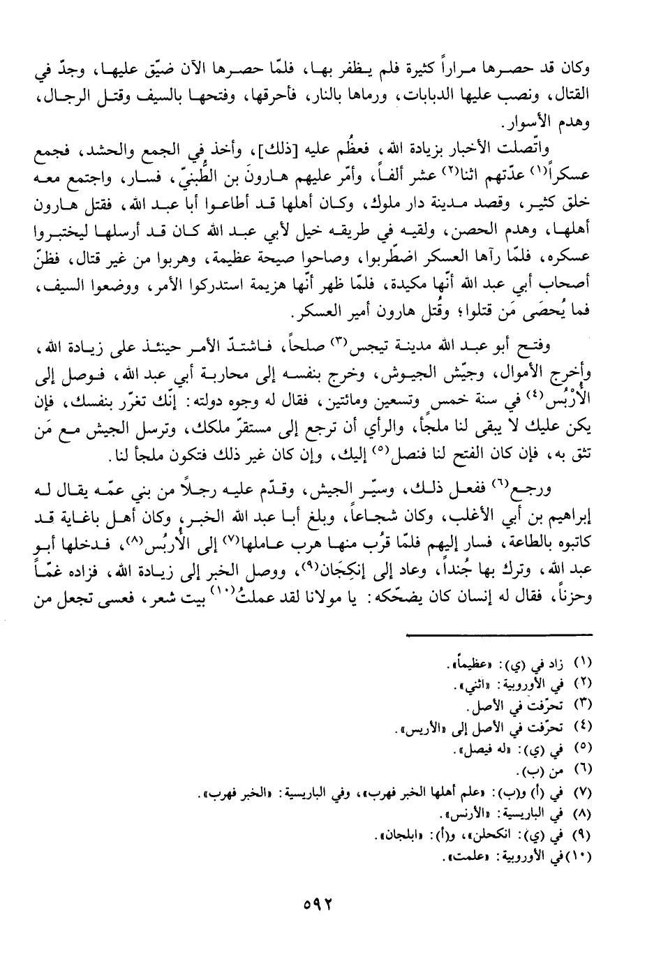 وَاتَّصَلَتِ الْأَخْبَارُ بِزِيَادَةِ اللَّهِ، فَعَظُمَ عَلَيْهِ [ذَلِكَ] ، وَأَخَذَ فِي الْجَمْعِ وَالْحَشْدِ، فَجَمَعَ عَسْكَرًا عُدَّتُهُمُ اثْنَا عَشَرَ أَلْفًا، وَأَمَّرَ عَلَيْهِمْ هَارُونَ بْنَ الطُّبْنِيِّ، فَسَارَ، وَاجْتَمَعَ مَعَهُ خَلْقٌ كَثِيرٌ، وَقَصَدَ مَدِينَةَ دَارِ مُلُوكٍ، وَكَانَ أَهْلُهَا قَدْ أَطَاعُوا أَبَا عَبْدِ اللَّهِ، فَقَتَلَ هَارُونُ أَهْلَهَا، وَهَدَمَ الْحِصْنَ، وَلَقِيَهُ فِي طَرِيقِهِ خَيْلٌ لِأَبِي عَبْدِ اللَّهِ كَانَ قَدْ أَرْسَلَهَا لِيَخْتَبِرُوا عَسْكَرَهُ، فَلَمَّا رَآهَا الْعَسْكَرُ اضْطَرَبُوا وَصَاحُوا صَيْحَةً عَظِيمَةً، وَهَرَبُوا مِنْ غَيْرِ قِتَالٍ، فَظَنَّ أَصْحَابُ أَبِي عَبْدِ اللَّهِ أَنَّهَا مَكِيدَةٌ، فَلَمَّا ظَهَرَ أَنَّهَا هَزِيمَةٌ اسْتَدْرَكُوا الْأَمْرَ، وَوَضَعُوا السَّيْفَ، فَمَا يُحْصَى مَنْ قُتِلُوا، وَقُتِلَ هَارُونُ أَمِيرُ الْعَسْكَرِ، وَفَتَحَ أَبُو عَبْدِ اللَّهِ مَدِينَةَ تِيجِسَ صُلْحًا، فَاشْتَدَّ الْأَمْرُ حِينَئِذٍ عَلَى زِيَادَةِ اللَّهِ، وَأَخْرَجَ الْأَمْوَالَ، وَجَيَّشَ الْجُيُوشَ وَخَرَجَ بِنَفْسِهِ إِلَى مُحَارَبَةِ أَبِي عَبْدِ اللَّهِ، فَوَصَلَ إِلَى الْأُرْبُسِ فِي سَنَةِ خَمْسٍ وَتِسْعِينَ وَمِائَتَيْنِ، فَقَالَ لَهُ وُجُوهُ دَوْلَتِهِ: إِنَّكَ تُغَرِّرُ بِنَفْسِكَ، فَإِنْ يَكُنْ عَلَيْكَ لَا يَبْقَى لَنَا مَلْجَأٌ، وَالرَّأْيُ أَنْ تَرْجِعَ إِلَى مُسْتَقَرِّ مُلْكِكَ، وَتُرْسِلَ الْجَيْشَ مَعَ مَنْ تَثِقُ بِهِ فَإِنْ كَانَ