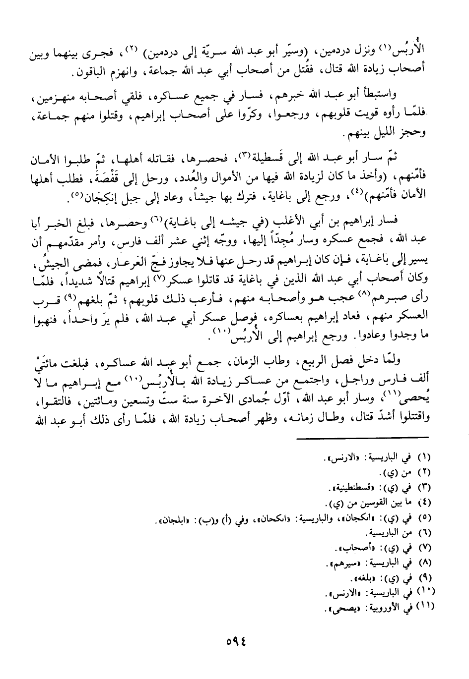 وَرَجَعَ إِبْرَاهِيمُ إِلَى الْأُرْبُسِ. وَلَمَّا دَخَلَ فَصْلُ الرَّبِيعِ، وَطَابَ الزَّمَانُ، جَمَعَ أَبُو عَبْدِ اللَّهِ عَسَاكِرَهُ، فَبَلَغَتْ مِائَتَيْ أَلْفَ فَارِسٍ وَرَاجِلٍ، وَاجْتَمَعَ مِنْ عَسَاكِرِ زِيَادَةِ اللَّهِ بِالْأُرْبُسِ مَعَ إِبْرَاهِيمَ مَا لَا يُحْصَى، وَسَارَ أَبُو عَبْدِ اللَّهِ أَوَّلَ جُمَادَى الْآخِرَةِ سَنَةَ سِتٍّ وَتِسْعِينَ وَمِائَتَيْنِ، فَالْتَقَوْا وَاقْتَتَلُوا أَشَدَّ قِتَالٍ وَطَالَ زَمَانُهُ، وَظَهَرَ أَصْحَابُ زِيَادَةِ اللَّهِ فَلَمَّا رَأَى ذَلِكَ أَبُو عَبْدِ اللَّهِ