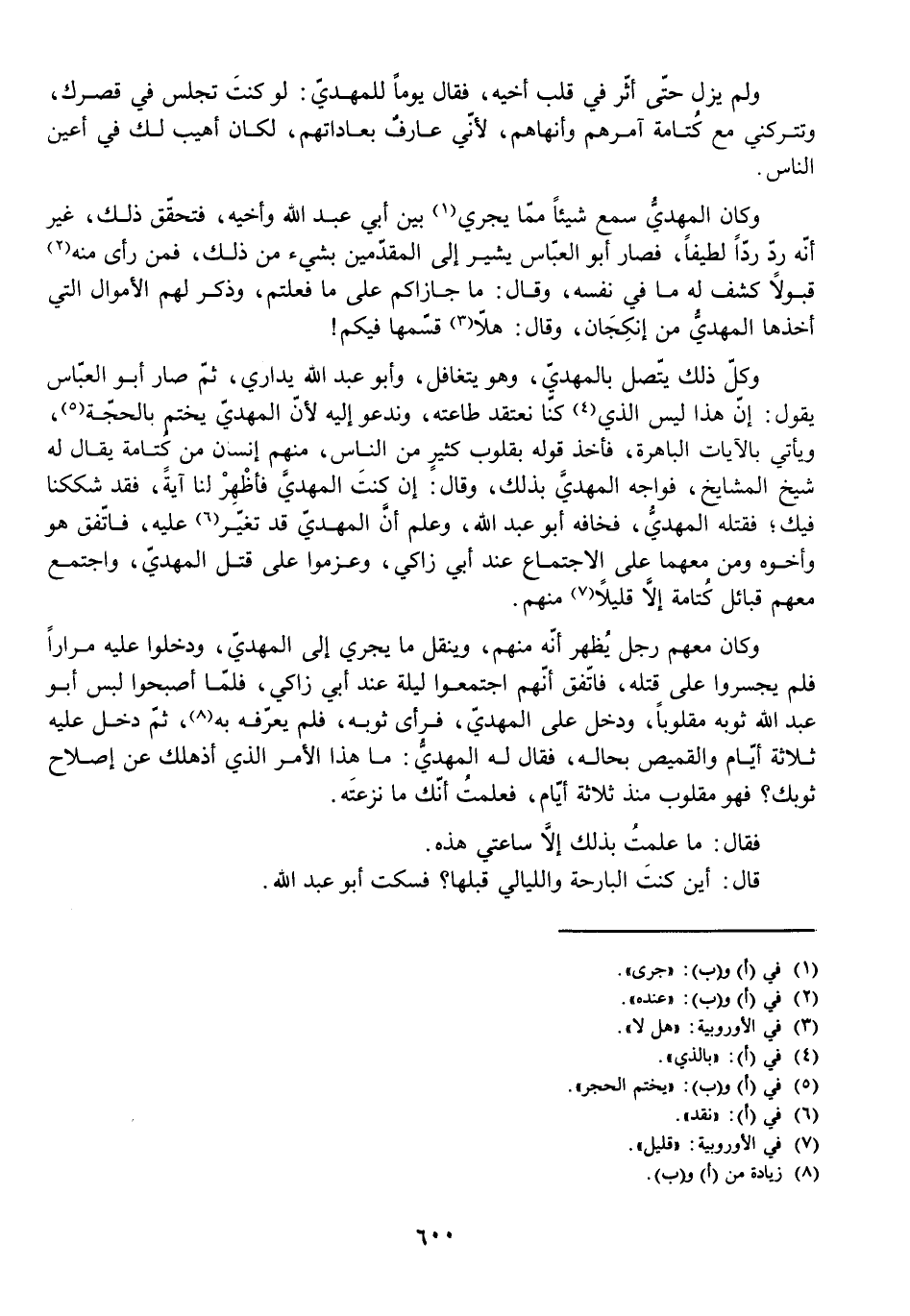 وَكَانَ الْمَهْدِيُّ سَمِعَ شَيْئًا مِمَّا يَجْرِي بَيْنَ أَبِي عَبْدِ اللَّهِ وَأَخِيهِ، فَتَحَقَّقَ ذَلِكَ، غَيْرَ أَنَّهُ رَدَّ رَدًّا لَطِيفًا، فَصَارَ أَبُو الْعَبَّاسِ يُشِيرُ إِلَى الْمُقَدَّمِينَ بِشَيْءٍ مِنْ ذَلِكَ، فَمَنْ رَأَى مِنْهُ قَبُولًا كَشَفَ لَهُ مَا فِي نَفْسِهِ، وَقَالَ: مَا جَازَاكُمْ عَلَى مَا فَعَلْتُمْ، وَذَكَرَ لَهُمُ الْأَمْوَالَ الَّتِي أَخَذَهَا الْمَهْدِيُّ مِنْ إِنْكِجَانَ، وَقَالَ: هَلَّا قَسَّمَهَا فِيكُمْ!