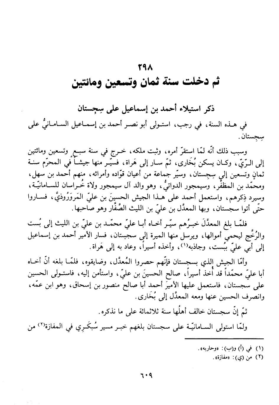 ذِكْرُ اسْتِيلَاءِ أَحْمَدَ بْنِ إِسْمَاعِيلَ عَلَى سِجِسْتَانَ