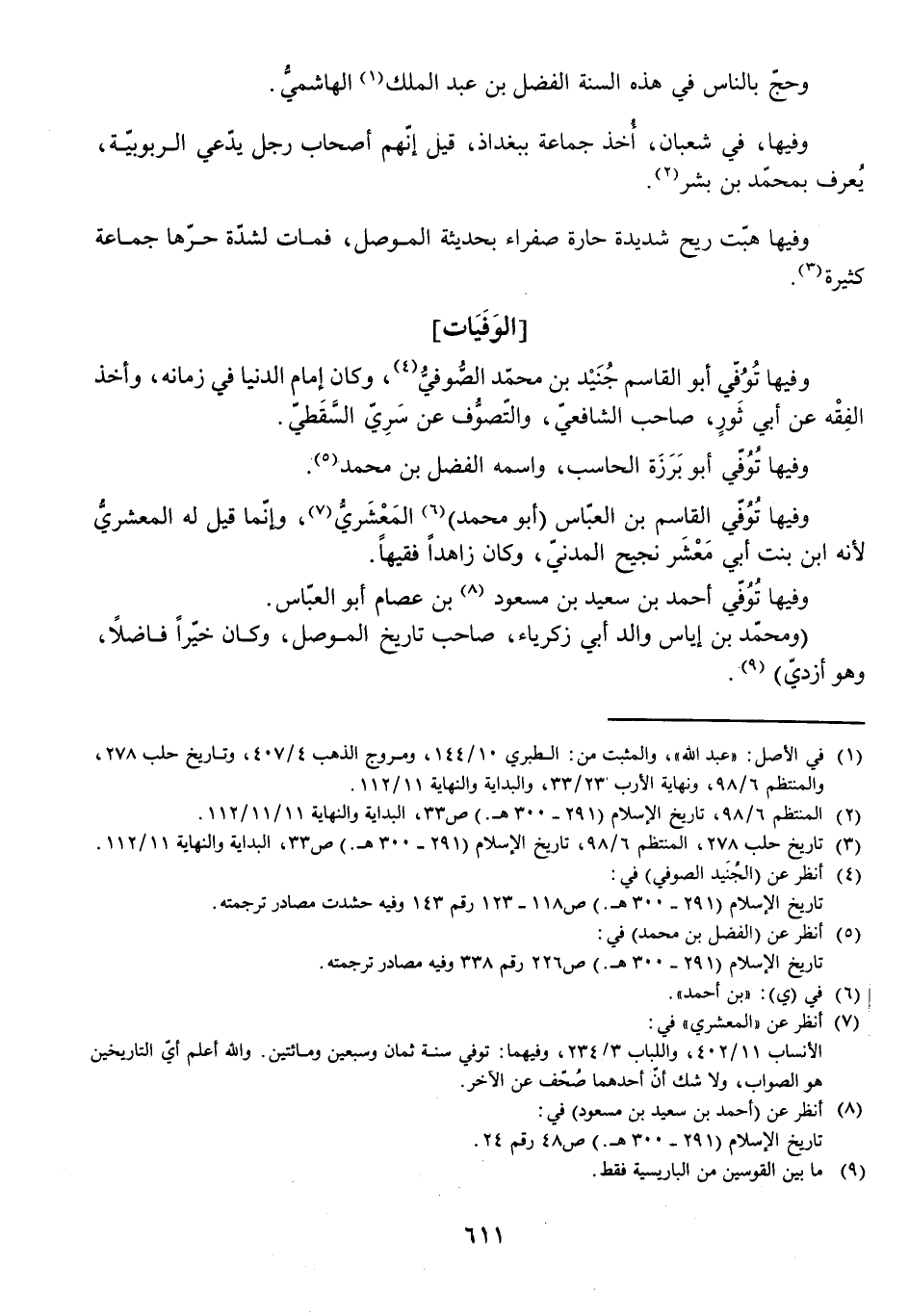 وَفِيهَا تُوُفِّيَ أَبُو الْقَاسِمِ جُنَيْدُ بْنُ مُحَمَّدٍ الصُّوفِيُّ، وَكَانَ إِمَامَ الدُّنْيَا فِي زَمَانِهِ، وَأَخَذَ الْفِقْهَ عَنْ أَبِي ثَوْرٍ، صَاحِبِ الشَّافِعِيِّ، وَالتَّصَوُّفَ عَنْ سَرِيٍّ السَّقَطِيِّ.