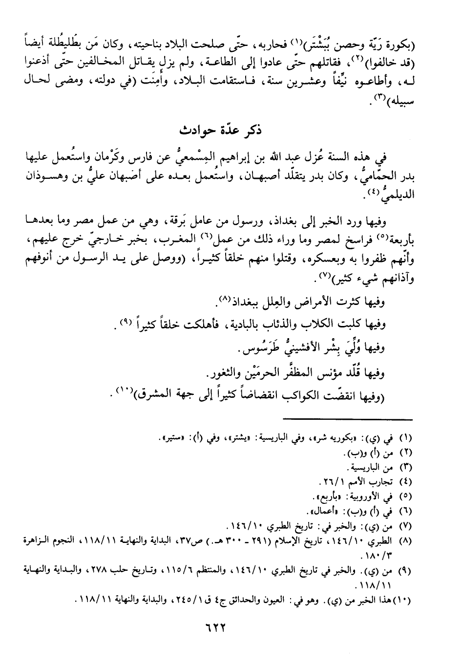 فِي هَذِهِ السَّنَةِ عُزِلَ عَبْدُ اللَّهِ بْنُ إِبْرَاهِيمَ الْمِسْمَعِيُّ عَنْ فَارِسَ وَكَرْمَانَ وَاسْتُعْمِلَ عَلَيْهَا بَدْرٌ الْحَمَّامِيُّ، وَكَانَ بَدْرٌ يَتَقَلَّدُ أَصْبَهَانَ، وَاسْتُعْمِلَ بَعْدَهُ عَلَى أَصْبَهَانَ عَلِيُّ بْنُ وَهْسُوذَانَ الدَّيْلَمَيُّ.
