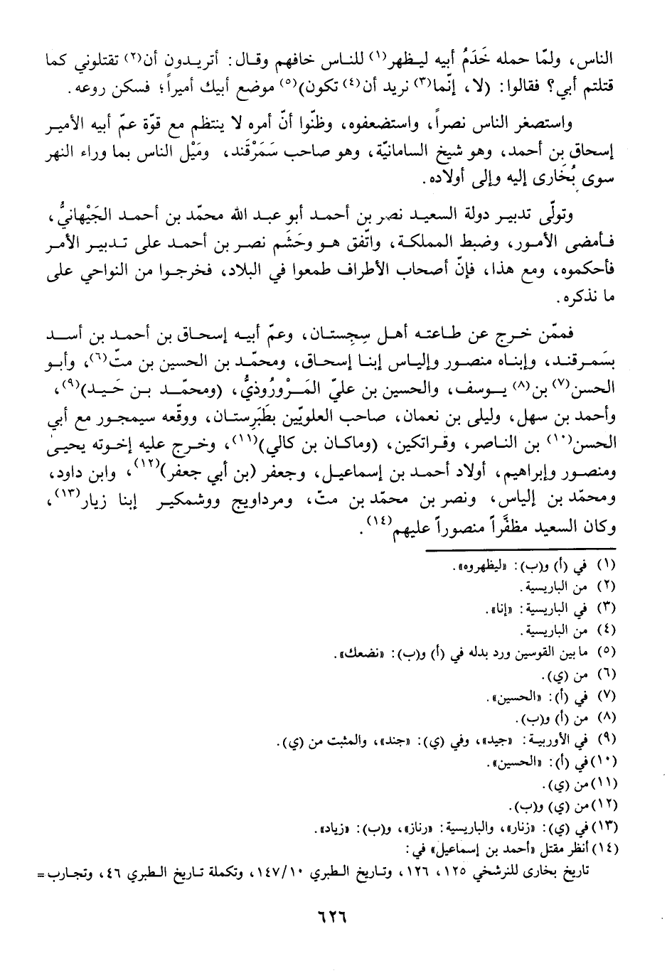 فَمِمَّنْ خَرَجَ عَنْ طَاعَتِهِ أَهْلُ سِجِسْتَانَ، وَعَمُّ أَبِيهِ إِسْحَاقُ بْنُ أَحْمَدَ بْنِ أَسَدٍ بِسَمَرْقَنْدَ، وَابْنَاهُ مَنْصُورٌ وَإِلْيَاسُ ابْنَا إِسْحَاقَ، وَمُحَمَّدُ بْنُ الْحُسَيْنِ بْنِ مَتٍّ، وَأَبُو الْحَسَنِ بْنُ يُوسُفَ، وَالْحُسَيْنُ بْنُ عَلِيٍّ الْمَرْوَرُوذِيُّ، (وَمُحَمَّدُ بْنُ حَيْدٍ) وَأَحْمَدُ بْنُ سَهْلٍ، وَلَيْلَى بْنُ نُعْمَانَ صَاحِبُ الْعَلَوِيِّينَ بِطَبَرِسْتَانَ، وَوَقَّعَهُ سِيمَجُورُ مَعَ أَبِي الْحَسَنِ بْنِ النَّاصِرِ، وَقُرَاتِكِينَ، (وَمَاكَانَ بْنُ كَالِيَّ) وَخَرَجَ عَلَيْهِ إِخْوَتُهُ يَحْيَى وَمَنْصُورٌ وَإِبْرَاهِيمُ، أَوْلَادُ أَحْمَدَ بْنِ إِسْمَاعِيلَ، وَجَعْفَرُ (بْنُ أَبِي جَعْفَرٍ) ، وَابْنُ دَاوُدَ، وَمُحَمَّدُ بْنُ إِلْيَاسَ، وَنَصْرُ بْنُ مُحَمَّدِ بْنِ مَتٍّ، وَمَرْدَاوِيجُ وَوَشْمَكِيرُ ابْنَا زَيَّارَ، وَكَانَ السَّعِيدُ مُظَفَّرًا مَنْصُورًا عَلَيْهِمْ.