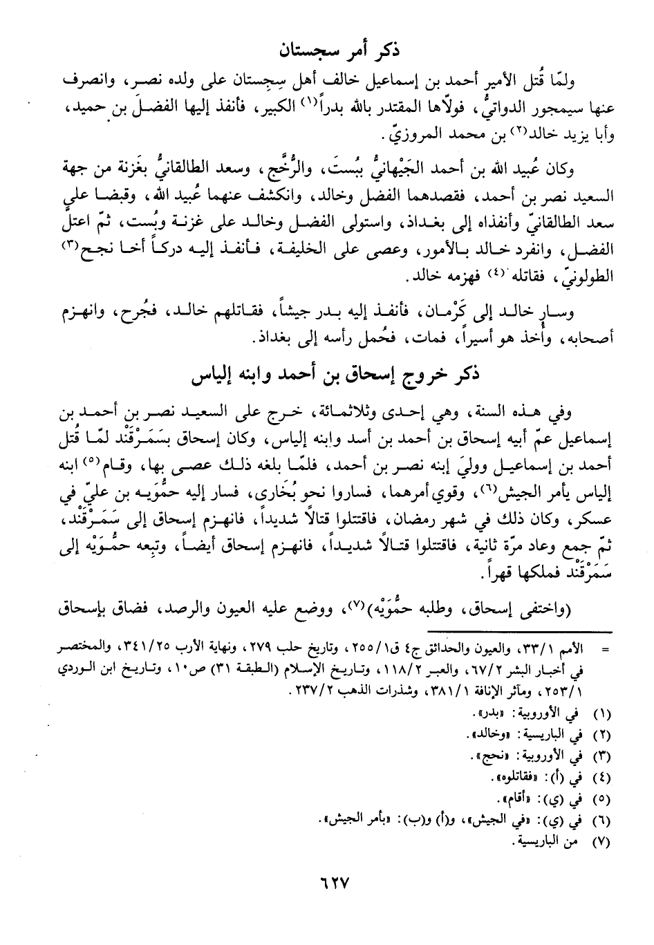 وَلَمَّا قُتِلَ الْأَمِيرُ أَحْمَدُ بْنُ إِسْمَاعِيلَ خَالَفَ أَهْلُ سِجِسْتَانَ عَلَى وَلَدِهِ نَصْرٍ وَانْصَرَفَ عَنْهَا سِيمَجُورُ الدَّوَاتِيُّ، فَوَلَّاهَا الْمُقْتَدِرُ بِاللَّهِ بَدْرًا الْكَبِيرَ، فَأَنْفَذَ إِلَيْهَا الْفَضْلَ بْنَ حُمَيْدٍ، وَأَبَا يَزِيدَ خَالِدَ بْنَ مُحَمَّدٍ الْمَرْوَزِيَّ، وَكَانَ عُبَيْدُ اللَّهِ بْنُ أَحْمَدَ الْجَيْهَانِيُّ بِبُسْتَ، وَالرُّخَّجِ، وَسَعْدٌ الطَّالْقَانِيُّ بِغَزْنَةَ مِنْ جِهَةِ السَّعِيدِ نَصْرِ بْنِ أَحْمَدَ، فَقَصَدَهُمَا الْفَضْلُ وَخَالِدٌ، وَانْكَشَفَ عَنْهُمَا عُبَيْدُ اللَّهِ، وَقَبَضَا عَلَى سَعْدٍ الطَّالْقَانِيُّ وَأَنْفَذَاهُ إِلَى بَغْدَاذَ، وَاسْتَوْلَى الْفَضْلُ وَخَالِدٌ عَلَى غَزْنَةَ وَبُسْتَ ثُمَّ اعْتَلَّ الْفَضْلُ، وَانْفَرَدَ خَالِدٌ بِالْأُمُورِ، وَعَصَى عَلَى الْخَلِيفَةِ، فَأَنْفَذَ إِلَيْهِ دَرَكًا أَخَا نَجَحٍ الطُّولُونِيِّ، فَقَاتَلَهُ فَهَزَمَهُ خَالِدٌ.