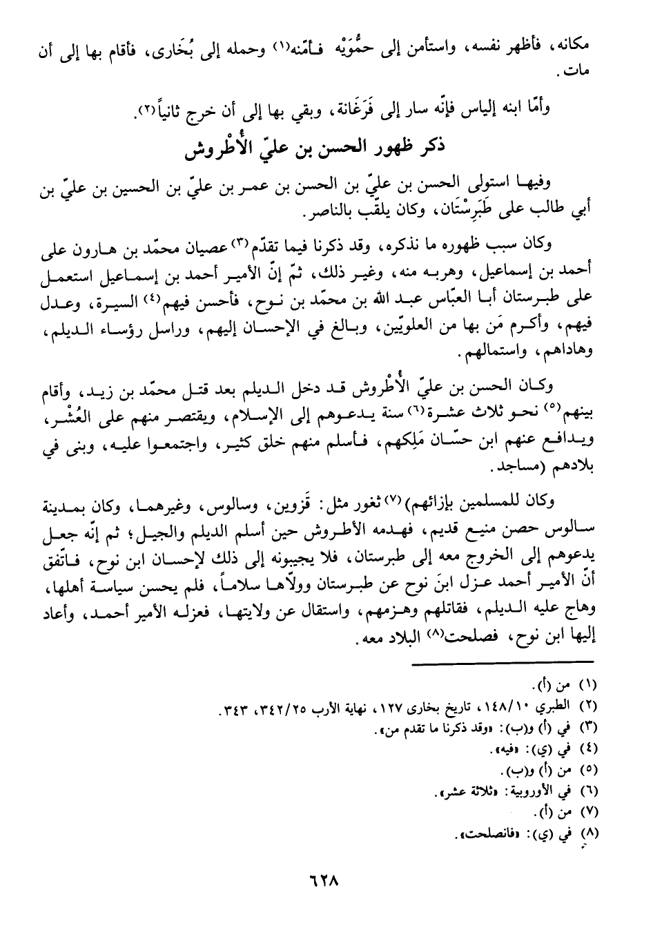 وَكَانَ لِلْمُسْلِمِينَ بِإِزَائِهِمْ) ثُغُورٌ مِثْلُ: قَزْوِينُ، وَسَالُوسُ، وَغَيْرُهُمَا وَكَانَ بِمَدِينَةِ سَالُوسَ حِصْنٌ مَنِيعٌ قَدِيمٌ، فَهَدَمَهُ الْأُطْرُوشُ حِينَ أَسْلَمَ الدَّيْلَمُ وَالْجِيلُ، ثُمَّ إِنَّهُ جَعَلَ يَدْعُوهُمْ إِلَى الْخُرُوجِ مَعَهُ إِلَى طَبَرِسْتَانَ، فَلَا يُجِيبُونَهُ إِلَى ذَلِكَ لِإِحْسَانِ ابْنِ نُوحٍ، فَاتَّفَقَ أَنَّ الْأَمِيرَ أَحْمَدَ عَزَلَ ابْنَ نُوحٍ عَنْ طَبَرِسْتَانَ وَوَلَّاهُمَا سَلَّامًا، فَلَمْ يُحْسِنْ سِيَاسَةَ أَهْلِهَا، وَهَاجَ عَلَيْهِ الدَّيْلَمُ، فَقَاتَلَهُمْ وَهَزَمَهُمْ، وَاسْتَقَالَ عَنْ وِلَايَتِهَا، فَعَزَلَهُ الْأَمِيرُ أَحْمَدُ، وَأَعَادَ إِلَيْهَا ابْنَ نُوحٍ، فَصَلَحَتِ الْبِلَادُ مَعَهُ.