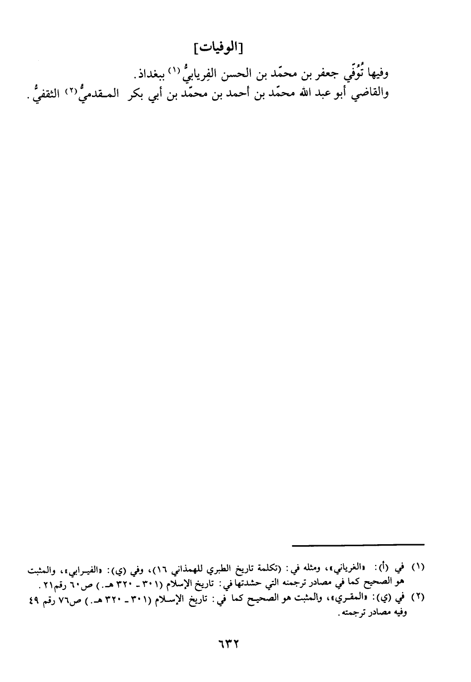 وَفِيهَا تُوُفِّيَ جَعْفَرُ بْنُ مُحَمَّدِ بْنِ الْحَسَنِ الْفِرْيَابِيُّ بِبَغْدَاذَ، وَالْقَاضِي أَبُو عَبْدِ اللَّهِ مُحَمَّدُ بْنُ أَحْمَدَ بْنِ مُحَمَّدِ بْنِ أَبِي بَكْرٍ الْمُقَدَّمِيُّ الثَّقَفِيُّ.