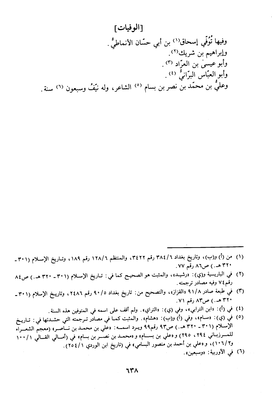 وَفِيهَا تُوُفِّيَ إِسْحَاقُ بْنُ أَبِي حَسَّانَ الْأَنْمَاطِيُّ، وَإِبْرَاهِيمُ بْنُ شَرِيكٍ، وَأَبُو عِيسَى بْنُ الْعَرَّادِ، وَأَبُو الْعَبَّاسِ الْبَرَّانِيُّ، وَعَلِيُّ بْنُ مُحَمَّدِ بْنِ نَصْرِ بْنِ بَسَّامٍ الشَّاعِرُ وَلَهُ نَيِّفٌ وَسَبْعُونَ سَنَةً.