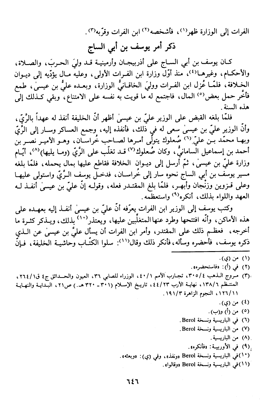 وَكَتَبَ يُوسُفُ إِلَى الْوَزِيرِ ابْنِ الْفُرَاتِ أَنَّ عَلِيَّ بْنَ عِيسَى أَنْفَذَ إِلَيْهِ بِعَهْدِهِ عَلَى هَذِهِ الْأَمَاكِنِ، وَأَنَّهُ افْتَتَحَهَا وَطَرَدَ مِنْهَا الْمُتَغَلِّبِينَ عَلَيْهَا، وَيَعْتَذِرُ بِذَلِكَ، وَيَذْكُرُ كَثْرَةَ مَا أَخْرَجَهُ، فَعَظُمَ ذَلِكَ عَلَى الْمُقْتَدِرِ، وَأَمَرَ ابْنَ الْفُرَاتِ أَنْ يَسْأَلَ عَلِيَّ بْنَ عِيسَى عَنِ الَّذِي ذَكَرَهُ يُوسُفُ، فَأَحْضَرَهُ وَسَأَلَهُ، فَأَنْكَرَ ذَلِكَ، وَقَالَ: سَلُوا الْكُتَّابَ وَحَاشِيَةَ الْخَلِيفَةِ، فَإِنَّ