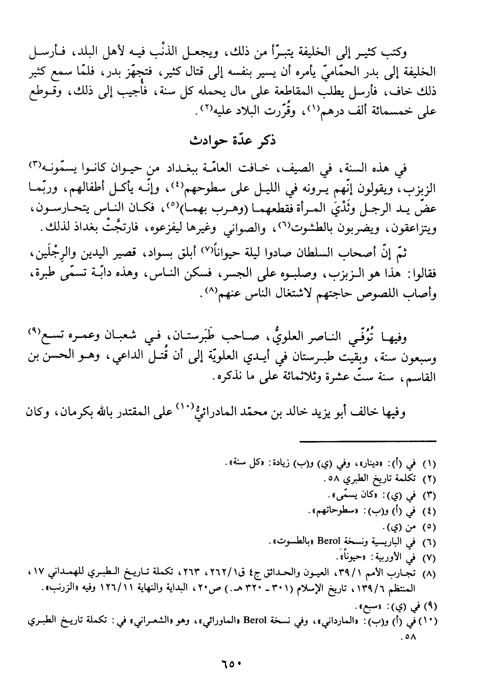 فِي هَذِهِ السَّنَةِ، فِي الصَّيْفِ، خَافَتِ الْعَامَّةُ بِبَغْدَادَ مِنْ حَيَوَانٍ كَانُوا يُسَمُّونَهُ الزَّبْزَبَ، وَيَقُولُونَ إِنَّهُمْ يَرَوْنَهُ فِي اللَّيْلِ عَلَى سُطُوحِهِمْ، وَإِنَّهُ يَأْكُلُ أَطْفَالَهُمْ، وَرُبَّمَا عَضَّ يَدَ الرَّجُلِ وَثَدْيَ الْمَرْأَةِ فَقَطَعَهُمَا، (وَهَرَبَ بِهِمَا) ، فَكَانَ النَّاسُ يَتَحَارَسُونَ، وَيَتَزَاعَقُونَ، وَيَضْرِبُونَ بِالطُّشُوتِ وَالصَّوَانِي وَغَيْرِهَا لِيُفْزِعُوهُ فَارْتَجَّتْ بَغْدَاذُ لِذَلِكَ. ثُمَّ إِنَّ أَصْحَابَ السُّلْطَانِ صَادُوا لَيْلَةً حَيَوَانًا أَبْلَقَ بِسَوَادٍ، قَصِيرَ الْيَدَيْنِ وَالرِّجْلَيْنِ، فَقَالُوا: هَذَا هُوَ الزَّبْزَبُ، وَصَلَبُوهُ عَلَى الْجِسْرِ، فَسَكَنَ النَّاسُ، وَهَذِهِ دَابَّةٌ تُسَمَّى طَبْرَةَ، وَأَصَابَ اللُّصُوصُ حَاجَتَهُمْ لِاشْتِغَالِ النَّاسِ عَنْهُمْ.