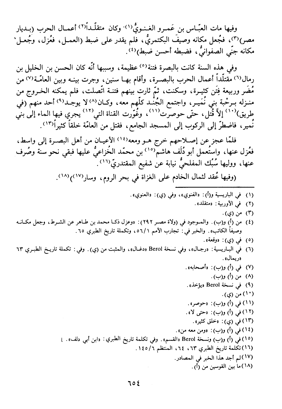 وَفِيهَا مَاتَ الْعَبَّاسُ بْنُ عَمْرٍو الْغَنَوِيُّ وَكَانَ مُتَقَلِّدًا أَعْمَالَ الْحَرْبِ (بِدِيَارِ مِصْرَ) ، فَجُعِلَ مَكَانَهُ وَصِيفٌ الْبُكْتُمْرِيُّ، فَلَمْ يَقْدِرْ عَلَى ضَبْطِ (الْعَمَلِ، فَعُزِلَ، وَجُعِلَ مَكَانَهُ جِنِّيٌّ الصَّفْوَانِيُّ، فَضَبَطَهُ أَحْسَنَ ضَبْطٍ) .