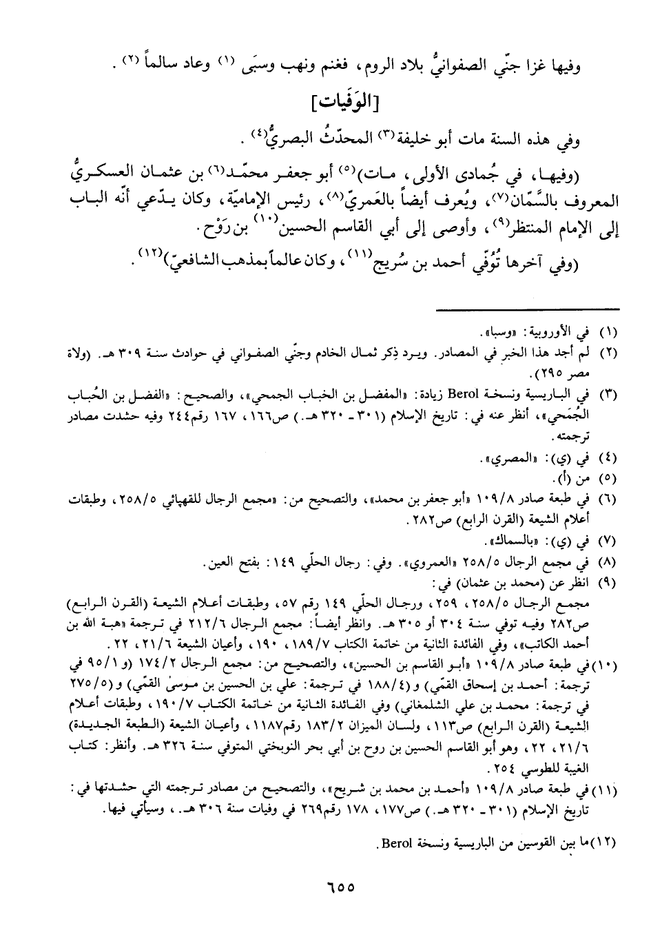 (وَفِيهَا، فِي جُمَادَى الْأُولَى، مَاتَ) أَبُو جَعْفَرِ بْنُ مُحَمَّدِ بْنِ عُثْمَانَ الْعَسْكَرِيُّ الْمَعْرُوفُ بِالسَّمَّانِ، وَيُعْرَفُ أَيْضًا بِالْعَمْرِيِّ، رَئِيسُ الْإِمَامِيَّةِ، وَكَانَ يَدَّعِي أَنَّهُ الْبَابُ إِلَى الْإِمَامِ الْمُنْتَظَرِ، وَأَوْصَى إِلَى أَبِي الْقَاسِمِ بْنِ الْحُسَيْنِ بْنِ رَوْحٍ.