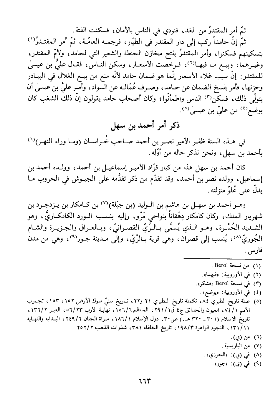 فِي هَذِهِ السَّنَةِ ظَفِرَ الْأَمِيرُ نَصْرُ بْنُ أَحْمَدَ صَاحِبُ خُرَاسَانَ (وَمَا وَرَاءَ النَّهْرِ) بِأَحْمَدَ بْنِ سَهْلٍ، وَنَحْنُ نَذْكُرُ حَالَهُ مِنْ أَوَّلِهِ.