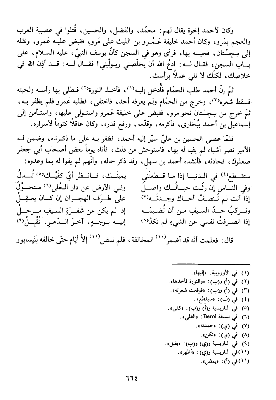 فَلَمَّا عَصَى الْحُسَيْنُ بْنُ عَلِيٍّ سَيَّرَ إِلَيْهِ أَحْمَدَ، فَظَفِرَ بِهِ عَلَى مَا ذَكَرْنَاهُ، وَضِمِنَ لَهُ الْأَمِيرُ نَصْرٌ أَشْيَاءَ لَمْ يَفِ لَهُ بِهَا، فَاسْتَوْحَشَ مِنْ ذَلِكَ، فَأَتَاهُ يَوْمًا بَعْضُ أَصْحَابِ أَبِي جَعْفَرٍ صُعْلُوكٍ، فَحَادَثَهُ، فَأَنْشَدَهُ أَحْمَدُ بْنُ سَهْلٍ، وَقَدْ ذَكَرَ حَالَهُ، وَأَنَّهُمْ لَمْ يَفُوا لَهُ بِمَا وَعَدُوهُ: