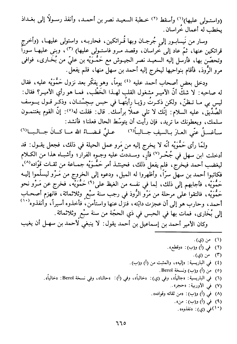 وَكَانَ الْأَمِيرُ أَحْمَدُ بْنُ إِسْمَاعِيلَ بْنِ أَحْمَدَ يَقُولُ: لَا يَنْبَغِي لِأَحْمَدَ بْنِ سَهْلٍ أَنْ يَغِيبَ