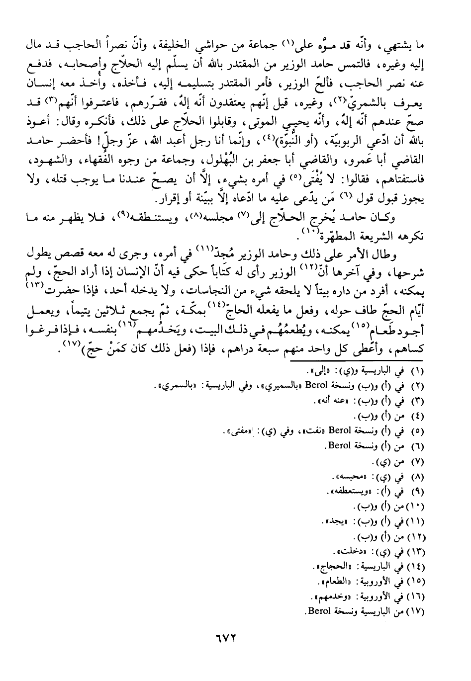 مَا يَشْتَهِي، وَأَنَّهُ قَدَّمُوهُ عَلَى جَمَاعَةٍ مِنْ حَوَاشِي الْخَلِيفَةِ، وَأَنَّ نَصْرًا الْحَاجِبَ قَدْ مَالَ إِلَيْهِ وَغَيْرَهُ، فَالْتَمَسَ حَامِدٌ الْوَزِيرُ مِنَ الْمُقْتَدِرِ بِاللَّهِ أَنْ يُسَلِّمَ إِلَيْهِ الْحَلَّاجَ وَأَصْحَابَهُ، فَدَفَعَ عَنْهُ نَصْرٌ الْحَاجِبُ، فَأَلَحَّ الْوَزِيرُ، فَأَمَرَ الْمُقْتَدِرُ بِتَسْلِيمِهِ إِلَيْهِ، فَأَخَذَهُ، وَأُخِذَ مَعَهُ إِنْسَانٌ يُعْرَفُ بِالشِّمْرِيِّ، وَغَيْرِهِ، قِيلَ إِنَّهُمْ يَعْتَقِدُونَ أَنَّهُ إِلَهٌ فَقَرَّرَهُمْ، فَاعْتَرَفُوا أَنَّهُمْ قَدْ صَحَّ عِنْدَهُمْ أَنَّهُ إِلَهٌ، وَأَنَّهُ يُحْيِي الْمَوْتَى، وَقَابَلُوا الْحَلَّاجَ عَلَى ذَلِكَ، فَأَنْكَرَهُ وَقَالَ: أَعُوذُ بِاللَّهِ أَنْ أَدَّعِي الرُّبُوبِيَّةَ، (أَوِ النُّبُوَّةَ) ، وَإِنَّمَا أَنَا رَجُلٌ أَعْبُدُ اللَّهَ، عَزَّ وَجَلَّ! فَأَحْضَرَ حَامِدٌ الْقَاضِيَ أَبَا عَمْرٍو وَالْقَاضِيَ أَبَا جَعْفَرِ بْنَ الْبُهْلُولِ، وَجَمَاعَةً مِنْ وُجُوهِ الْفُقَهَاءِ وَالشُّهُودِ، فَاسْتَفْتَاهُمْ، فَقَالُوا: لَا يُفْتَى فِي أَمْرِهِ بِشَيْءٍ إِلَّا أَنْ يَصِحَّ عِنْدَنَا مَا يُوجِبُ قَتْلَهُ، وَلَا يَجُوزُ قَبُولُ قَوْلِ مَنْ يَدَّعِي عَلَيْهِ مَا ادَّعَاهُ إِلَّا بِبَيِّنَةٍ أَوْ إِقْرَارٍ.