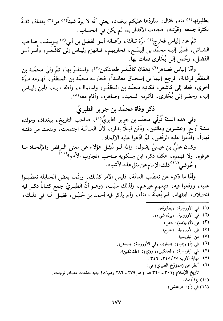 وَفِي هَذِهِ السَّنَةِ تُوُفِّيَ مُحَمَّدُ بْنُ جَرِيرٍ الطَّبَرِيُّ، صَاحِبُ التَّارِيخِ، بِبَغْدَاذَ، وَمَوْلِدُهُ سَنَةَ أَرْبَعٍ وَعِشْرِينَ وَمِائَتَيْنِ، وَدُفِنَ لَيْلًا بِدَارِهِ، لِأَنَّ الْعَامَّةَ اجْتَمَعَتْ، وَمَنَعَتْ مِنْ دَفْنِهِ نَهَارًا، وَادَّعَوْا عَلَيْهِ الرَّفْضَ، ثُمَّ ادَّعَوْا عَلَيْهِ الْإِلْحَادَ، وَكَانَ عَلِيُّ بْنُ عِيسَى يَقُولُ: وَاللَّهِ لَوْ سُئِلَ هَؤُلَاءِ عَنْ مَعْنَى الرَّفْضِ وَالْإِلْحَادِ مَا عَرَفُوهُ، وَلَا فَهِمُوهُ، هَكَذَا ذَكَرَهُ ابْنُ مِسْكَوَيْهِ صَاحِبُ " تَجَارِبِ الْأُمَمِ "، وَحُوشِيَ ذَلِكَ الْإِمَامُ عَنْ مِثْلِ هَذِهِ الْأَشْيَاءِ.