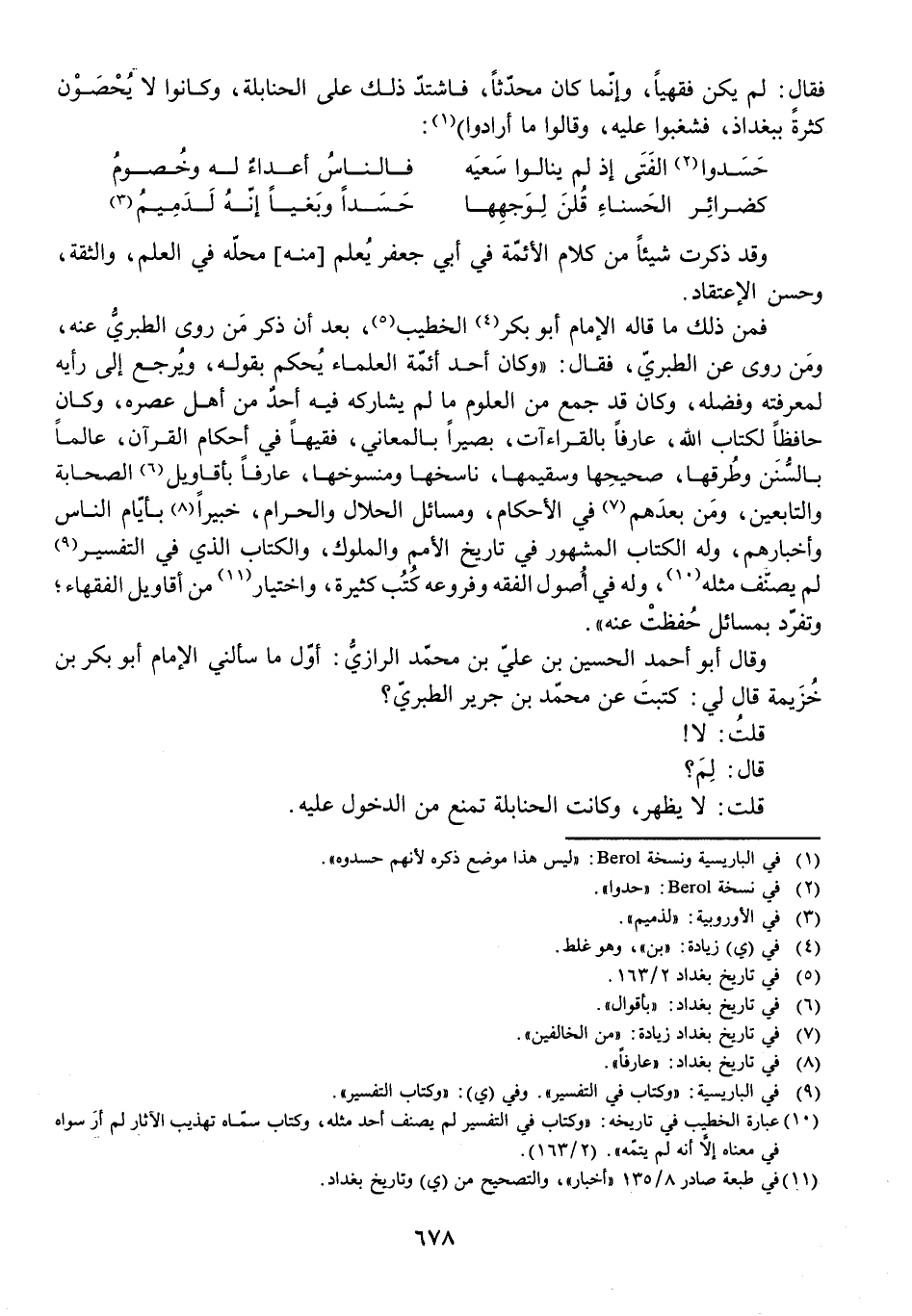 فَمِنْ ذَلِكَ مَا قَالَهُ الْإِمَامُ أَبُو بَكْرٍ الْخَطِيبُ، بَعْدَ أَنْ ذَكَرَ مَنْ رَوَى الطَّبَرِيُّ عَنْهُ، وَمَنْ رَوَى عَنِ الطَّبَرِيِّ، فَقَالَ: " وَكَانَ أَحَدَ أَئِمَّةِ الْعُلَمَاءِ يُحْكَمُ بِقَوْلِهِ، وَيُرْجَعُ إِلَى رَأْيِهِ لِمَعْرِفَتِهِ وَفَضْلِهِ، وَكَانَ قَدْ جَمَعَ مِنَ الْعُلُومِ مَا لَمْ يُشَارِكْهُ فِيهِ أَحَدٌ مِنْ أَهْلِ عَصْرِهِ، وَكَانَ حَافِظًا لِكِتَابِ اللَّهِ، عَارِفًا بِالْقِرَاءَاتِ، بَصِيرًا بِالْمَعَانِي، فَقِيهًا فِي أَحْكَامِ الْقُرْآنِ، عَالِمًا بِالسُّنَنِ وَطُرُقِهَا، صَحِيحِهَا وَسَقِيمِهَا، نَاسِخِهَا وَمَنْسُوخِهَا، عَارِفًا بِأَقَاوِيلِ الصَّحَابَةِ وَالتَّابِعِينَ، وَمَنْ بَعْدَهُمْ فِي الْأَحْكَامِ، وَمَسَائِلِ الْحَلَالِ وَالْحَرَامِ، خَبِيرًا بِأَيَّامِ النَّاسِ وَأَخْبَارِهِمْ، وَلَهُ الْكِتَابُ الْمَشْهُورُ فِي تَارِيخِ الْأُمَمِ وَالْمُلُوكِ، وَالْكِتَابُ الَّذِي فِي التَّفْسِيرِ لَمْ يُصَنَّفْ مِثْلُهُ، وَلَهُ فِي أُصُولِ الْفِقْهِ وَفُرُوعِهِ كُتُبٌ كَثِيرَةٌ، وَأَخْبَارٌ مِنْ أَقَاوِيلِ الْفُقَهَاءِ، وَتَفَرَّدَ بِمَسَائِلَ حُفِظَتْ عَنْهُ ".