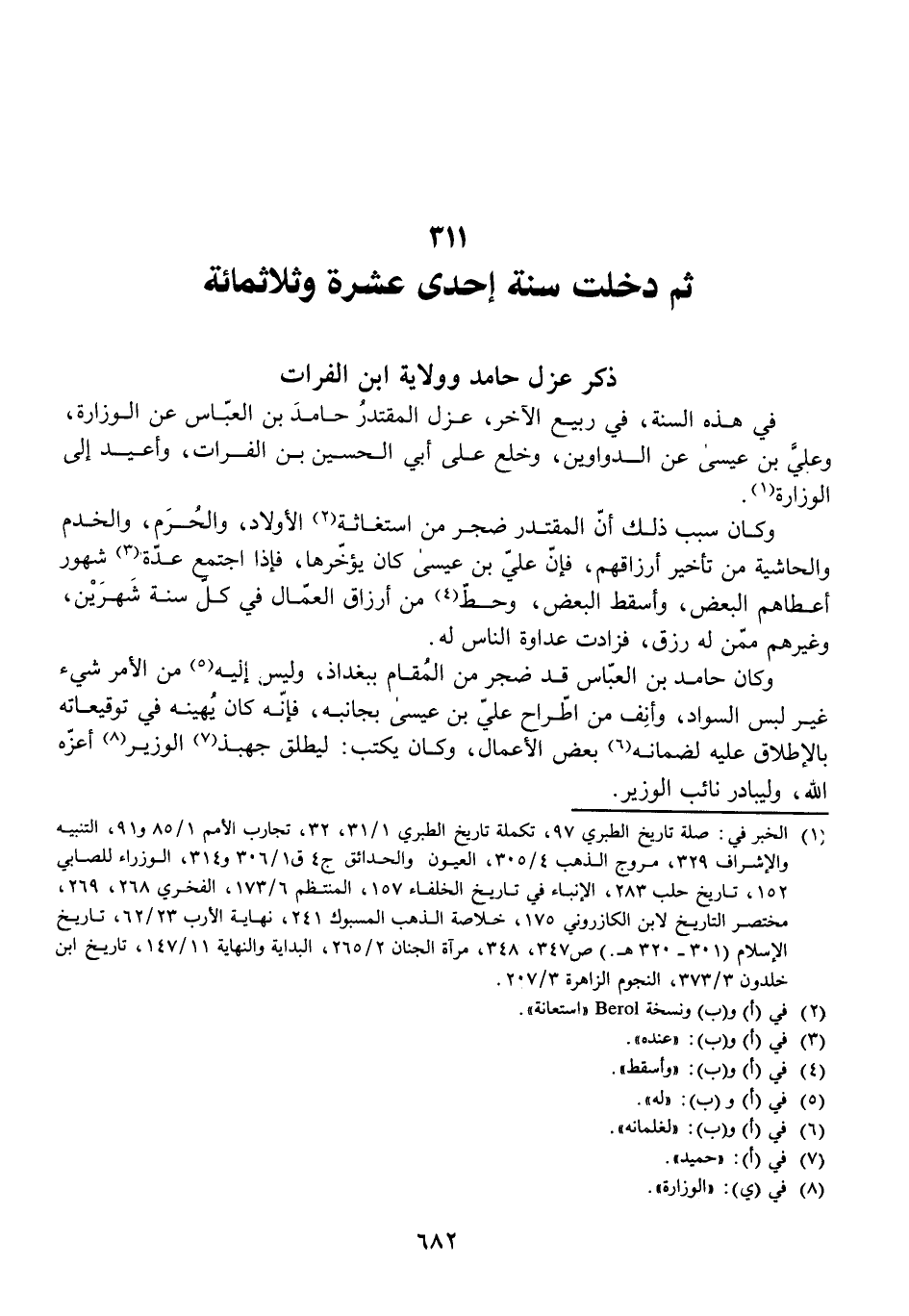 فِي هَذِهِ السَّنَةِ فِي رَبِيعٍ الْآخَرِ، عَزَلَ الْمُقْتَدِرُ حَامِدَ بْنَ الْعَبَّاسِ عَنِ الْوِزَارَةِ، وَعَلِيَّ بْنَ عِيسَى عَنِ الدَّوَاوِينِ، وَخَلَعَ عَلَى أَبِي الْحُسَيْنِ بْنِ الْفُرَاتِ، وَأُعِيدَ إِلَى الْوِزَارَةِ.