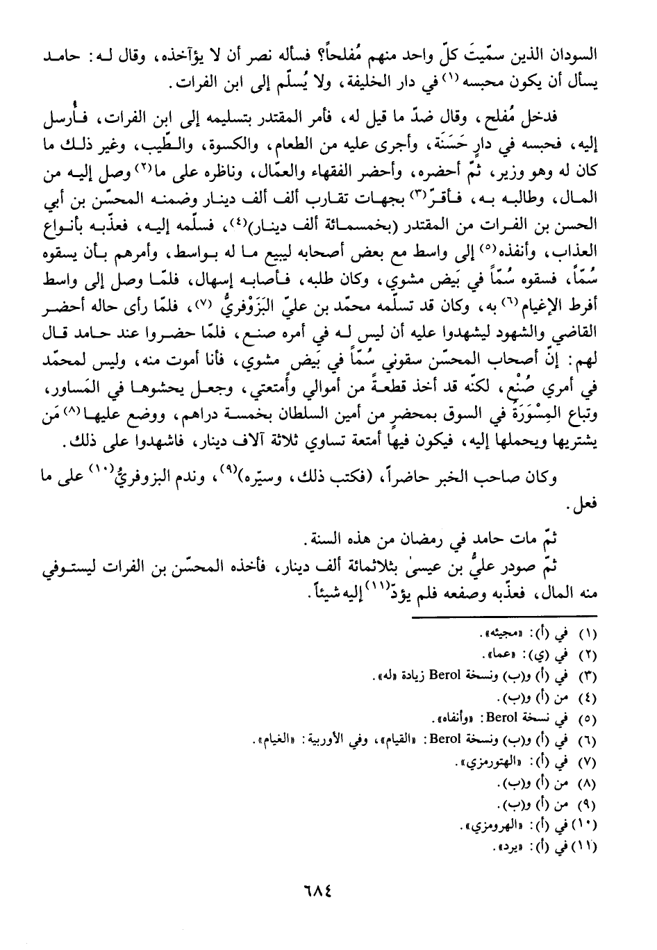 فَدَخَلَ مُفْلِحٌ، وَقَالَ ضِدَّ مَا قِيلَ لَهُ، فَأَمَرَ الْمُقْتَدِرُ بِتَسْلِيمِهِ إِلَى ابْنِ الْفُرَاتِ فَأُرْسِلَ إِلَيْهِ فَحَبَسَهُ فِي دَارٍ حَسَنَةٍ، وَأَجْرَى عَلَيْهِ مِنَ الطَّعَامِ، وَالْكُسْوَةِ، وَالطِّيبِ، وَغَيْرِ ذَلِكَ مَا كَانَ لَهُ وَهُوَ وَزِيرٌ، ثُمَّ أَحْضَرَهُ وَأَحْضَرَ الْفُقَهَاءَ وَالْعُمَّالَ، وَنَاظَرَهُ عَلَى مَا وَصَلَ إِلَيْهِ مِنَ الْمَالِ، وَطَالَبَهُ بِهِ، فَأَقَرَّ بِجِهَاتِ تُقَارِبُ أَلْفَ أَلْفِ دِينَارٍ وَضَمِنَهُ الْمُحَسِّنُ بْنُ أَبِي الْحَسَنِ بْنِ الْفُرَاتِ مِنَ الْمُقْتَدِرِ (بِخَمْسِمِائَةِ أَلْفِ دِينَارٍ) ، فَسَلَّمَهُ إِلَيْهِ، فَعَذَّبَهُ بِأَنْوَاعِ الْعَذَابِ، وَأَنْفَذَهُ إِلَى وَاسِطَ مَعَ بَعْضِ أَصْحَابِهِ لِيَبِيعَ مَا لَهُ بِوَاسِطَ، وَأَمَرَهُمْ بِأَنْ يَسْقُوهُ سُمًّا، فَسَقَوْهُ سُمًّا فِي بَيْضٍ مَشْوِيٍّ، وَكَانَ طَلَبَهُ، فَأَصَابَهُ إِسْهَالٌ، فَلَمَّا وَصَلَ إِلَى وَاسِطَ أَفْرَطَ الْإِغْيَامُ بِهِ، وَكَانَ قَدْ تَسَلَّمَهُ مُحَمَّدُ بْنُ عَلِيٍّ الْبَزَوْفَرِيُّ، فَلَمَّا رَأَى حَالَهُ أَحْضَرَ الْقَاضِيَ وَالشُّهُودَ لِيَشْهَدُوا عَلَيْهِ أَنْ لَيْسَ لَهُ فِي أَمْرِهِ صُنْعٌ فَلَمَّا حَضَرُوا عِنْدَ حَامِدٍ قَالَ لَهُمْ: إِنَّ أَصْحَابَ الْمُحَسِّنِ سَقَوْنِي سُمًّا فِي بَيْضٍ مَشْوِيٍّ فَأَنَا أَمُوتُ مِنْهُ، وَلَيْسَ لِمُحَمَّدٍ فِي أَمْرِي صُنْعٌ، لَكِنَّهُ قَدْ أَخَذَ قِطْعَةً مِنْ أَمْوَالِي وَأَمْتِعَتِي، وَجَعَلَ يَحْشُوهَا فِي الْمَسَاوِرِ، وَتُبَاعُ الْمِسْوَرَةُ فِي السُّوقِ بِمَحْضَرٍ مِنْ أَمِينِ السُّلْطَانِ بِخَمْسَةِ دَرَاهِمَ، وَوَضَعَ عَلَيْهَا مَنْ يَشْتَرِيهَا، وَيَحْمِلُهَا إِلَيْهِ، فَيَكُونُ فِيهَا أَمْتِعَةٌ تُسَاوِي ثَلَاثَةَ آلَافِ دِينَارٍ، فَاشْهَدُوا عَلَى ذَلِكَ.