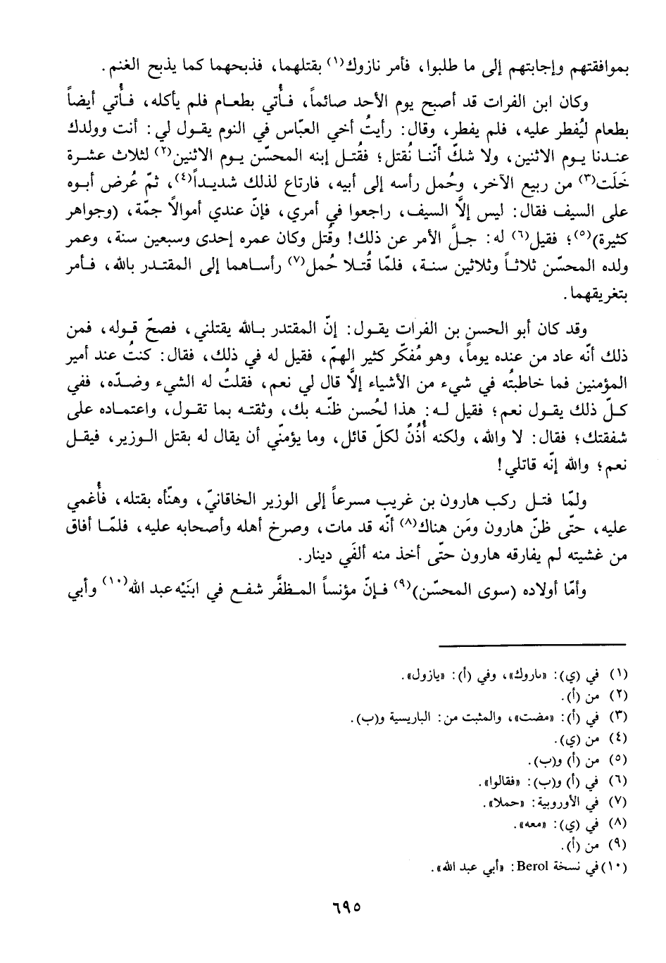 وَقَدْ كَانَ أَبُو الْحَسَنِ بْنُ الْفُرَاتِ يَقُولُ: إِنَّ الْمُقْتَدِرَ بِاللَّهِ يَقْتُلُنِي، فَصَحَّ قَوْلُهُ، فَمِنْ ذَلِكَ أَنَّهُ عَادَ مِنْ عِنْدِهِ يَوْمًا، وَهُوَ مُفَكِّرٌ كَثِيرُ الْهَمِّ، فَقِيلَ لَهُ فِي ذَلِكَ، فَقَالَ: كُنْتُ عِنْدَ أَمِيرِ الْمُؤْمِنِينَ فَمَا خَاطَبْتُهُ فِي شَيْءٍ مِنَ الْأَشْيَاءِ إِلَّا قَالَ لِي نَعَمْ، فَقُلْتُ لَهُ الشَّيْءَ وَضِدَّهُ، فَفِي كُلِّ ذَلِكَ يَقُولُ نَعَمْ، فَقِيلَ لَهُ: هَذَا لِحُسْنِ ظَنِّهِ بِكَ، وَثِقَتِهِ بِمَا تَقُولُ، وَاعْتِمَادِهِ عَلَى شَفَقَتِكَ، فَقَالَ: لَا وَاللَّهِ، وَلَكِنَّهُ أُذُنٌ لِكُلِّ قَائِلٍ، وَمَا يَؤْمِنِّي أَنْ يُقَالَ لَهُ بِقَتْلِ الْوَزِيرِ، فَيَقُولَ نَعَمْ وَاللَّهِ إِنَّهُ قَاتِلِي!