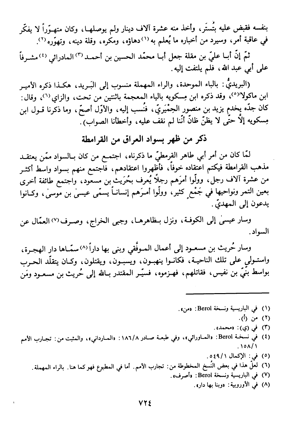 لَمَّا كَانَ مِنْ أَمْرِ أَبِي طَاهِرٍ الْقَرْمَطِيِّ مَا ذَكَرْنَاهُ، اجْتَمَعَ مَنْ كَانَ بِالسَّوَادِ مِمَّنْ يَعْتَقِدُ مَذْهَبَ الْقَرَامِطَةِ فَيَكْتُمُ اعْتِقَادَهُ خَوْفًا، فَأَظْهَرُوا اعْتِقَادَهُمْ، فَاجْتَمَعَ مِنْهُمْ بِسَوَادِ وَاسِطَ أَكْثَرُ مِنْ عَشَرَةِ آلَافِ رَجُلٍ، وَوَلَّوْا أَمْرَهُمْ رَجُلًا يُعْرَفُ بِحُرَيْثِ بْنِ مَسْعُودٍ، وَاجْتَمَعَ طَائِفَةٌ أُخْرَى بِعَيْنِ التَّمْرِ وَنَوَاحِيهَا فِي جَمْعٍ كَثِيرٍ، وَوَلَّوْا أَمْرَهُمْ إِنْسَانًا يُسَمَّى عِيسَى بْنَ مُوسَى، وَكَانُوا يَدْعُونَ إِلَى الْمَهْدِيِّ.