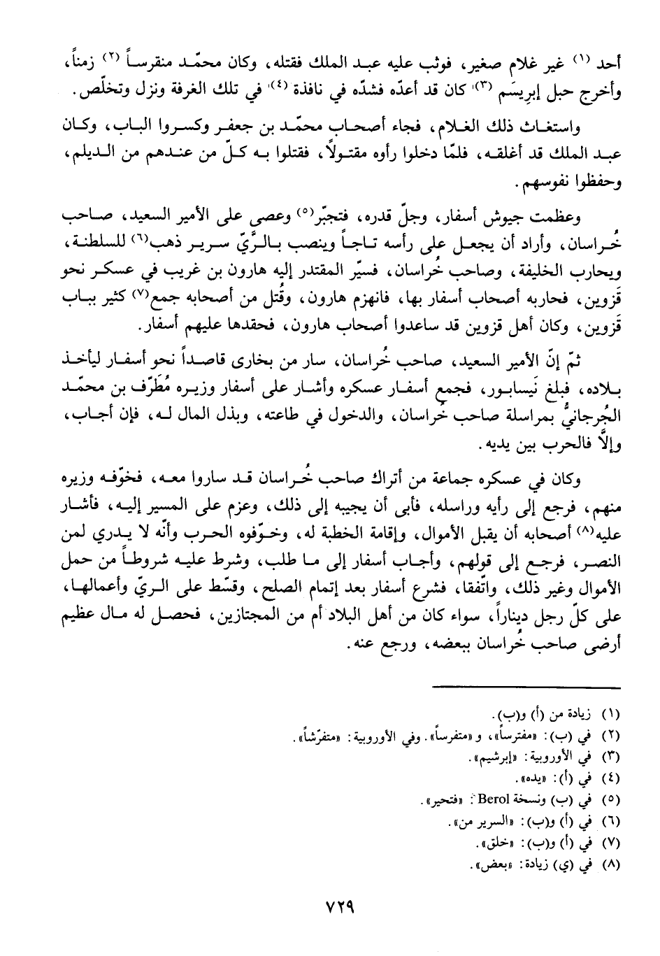 أَحَدٌ غَيْرَ غُلَامٍ صَغِيرٍ، فَوَثَبَ عَلَيْهِ عَبْدُ الْمَلِكِ فَقَتَلَهُ، وَكَانَ مُحَمَّدٌ مُنَقْرَسًا زَمِنًا، وَأَخْرَجَ حَبْلَ إِبْرَيْسَمَ كَانَ قَدْ أَعَدَّهُ فَشَدَّهُ فِي نَافِذَةٍ فِي تِلْكَ الْغُرْفَةِ وَنَزَلَ وَتَخَلَّصَ.
