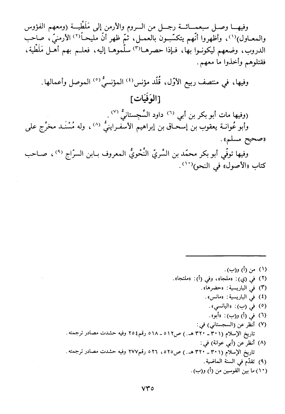 وَفِيهَا تُوُفِّيَ أَبُو بَكْرٍ مُحَمَّدُ بْنُ السَّرِيِّ النَّحْوِيُّ الْمَعْرُوفُ بِابْنِ السَّرَّاجِ صَاحِبُ كِتَابِ الْأُصُولِ، فِي النَّحْوِ) .
