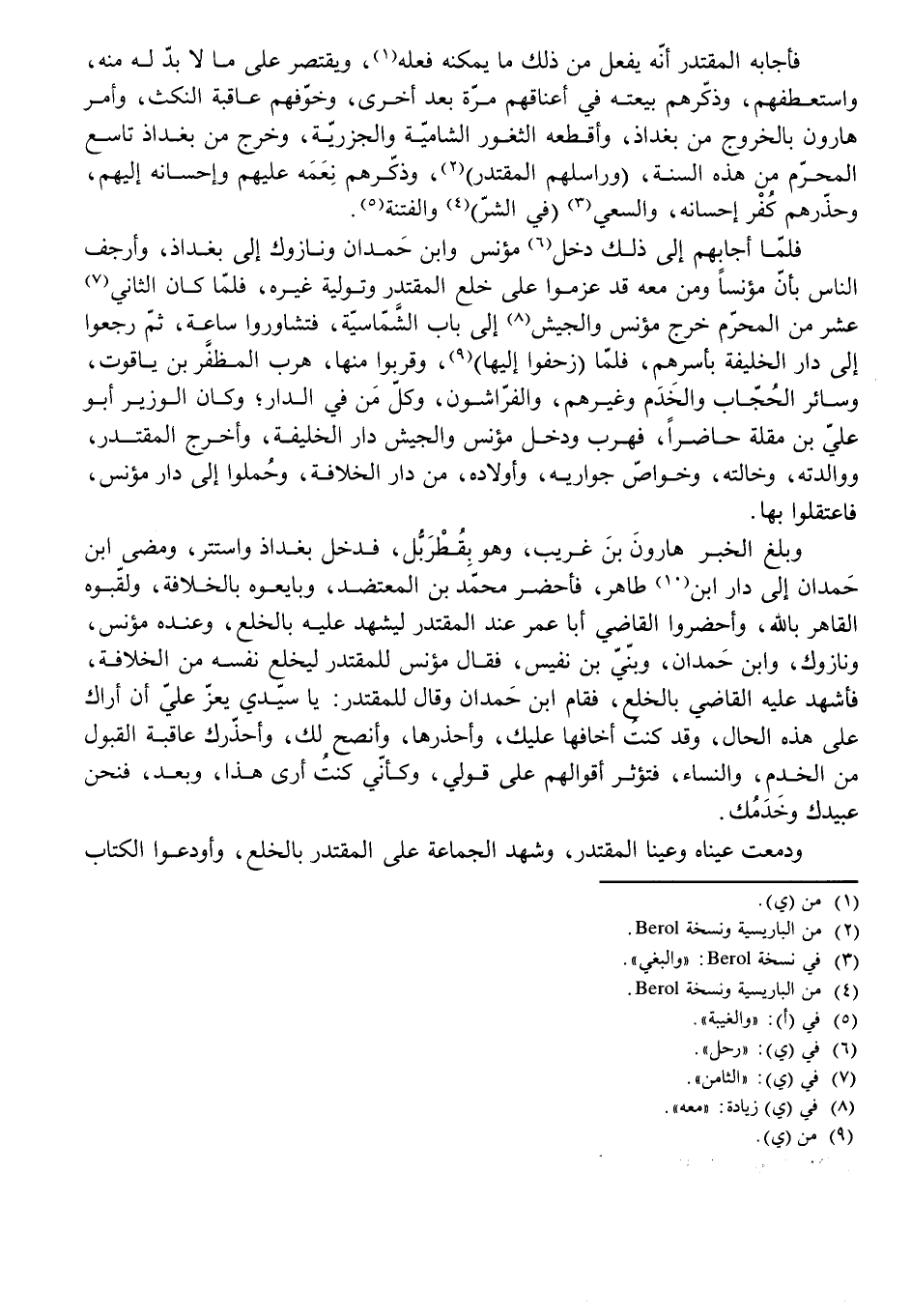 فَأَجَابَهُ الْمُقْتَدِرُ أَنَّهُ يَفْعَلُ مِنْ ذَلِكَ مَا يُمْكِنُهُ فِعْلُهُ، وَيَقْتَصِرُ عَلَى مَا لَا بُدَّ لَهُ مِنْهُ، وَاسْتَعْطَفَهُمْ، وَذَكَّرَهُمْ بَيْعَتَهُ فِي أَعْنَاقِهِمْ مَرَّةً بَعْدَ أُخْرَى، وَخَوَّفَهُمْ عَاقِبَةَ النَّكْثِ، وَأَمَرَ هَارُونَ بِالْخُرُوجِ مِنْ بَغْدَاذَ، وَأَقْطَعَهُ الثُّغُورَ الشَّامِيَّةَ وَالْجُزُرِيَّةَ، وَخَرَجَ مِنْ بَغْدَاذَ تَاسِعَ الْمُحَرَّمِ مِنْ هَذِهِ السَّنَةِ، (وَرَاسَلَهُمُ الْمُقْتَدِرُ) ، وَذَكَّرَهُمْ نِعَمَهُ عَلَيْهِمْ وَإِحْسَانَهُ إِلَيْهِمْ، وَحَذَّرَهُمْ كُفْرَ إِحْسَانِهِ، وَالسَّعْيَ فِي الشَّرِّ وَالْفِتْنَةِ.
