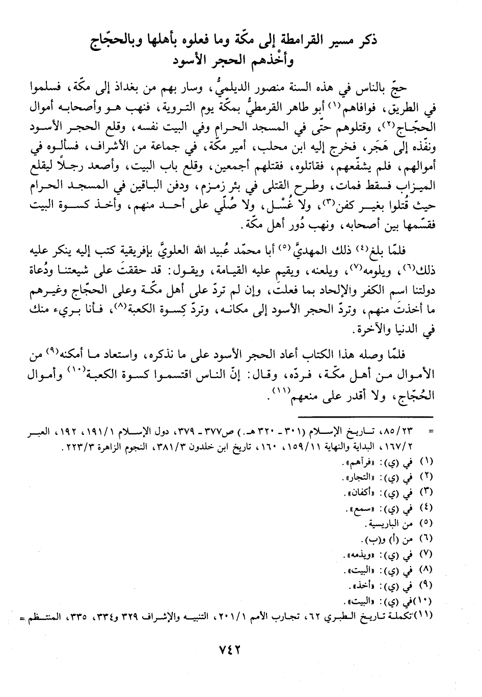 ذِكْرُ مَسِيرِ الْقَرَامِطَةِ إِلَى مَكَّةَ وَمَا فَعَلُوهُ بِأَهْلِهَا وَبِالْحُجَّاجِ وَأَخْذِهِمُ الْحَجَرَ الْأَسْوَدَ