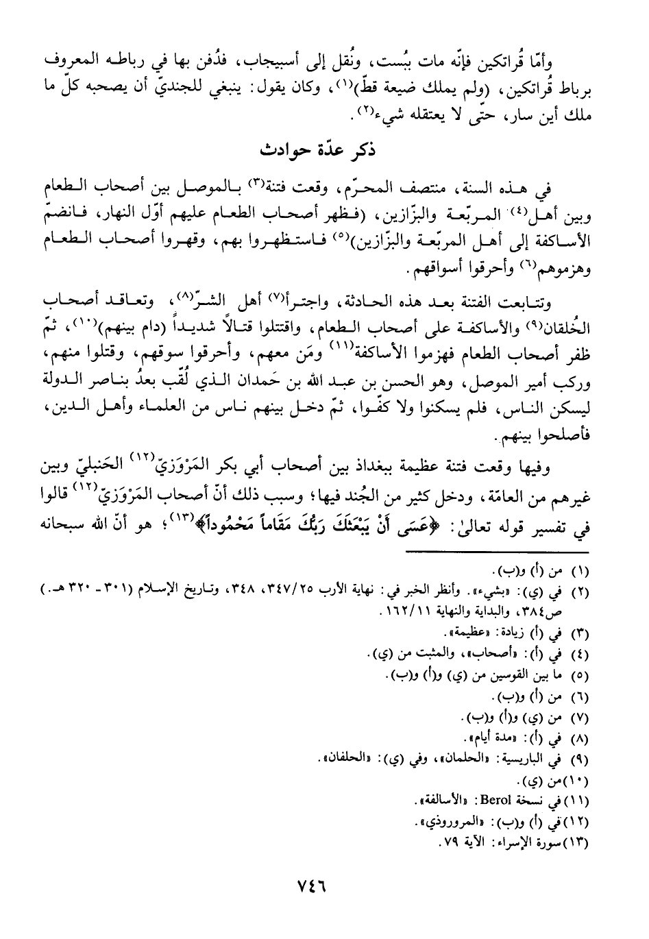 وَفِيهَا وَقَعَتْ فِتْنَةٌ عَظِيمَةٌ بِبَغْدَاذَ بَيْنَ أَصْحَابِ أَبِي بَكْرٍ الْمَرْوَزِيِّ الْحَنْبَلِيِّ وَبَيْنَ غَيْرِهِمْ مِنَ الْعَامَّةِ، وَدَخَلَ كَثِيرٌ مِنَ الْجُنْدِ فِيهَا، وَسَبَبُ ذَلِكَ أَنَّ أَصْحَابَ الْمَرْوَزِيِّ قَالُوا فِي تَفْسِيرِ قَوْلِهِ تَعَالَى: {عَسَى أَنْ يَبْعَثَكَ رَبُّكَ مَقَامًا مَحْمُودًا} [الإسراء: 79] ، هُوَ أَنَّ اللَّهَ سُبْحَانَهُ
