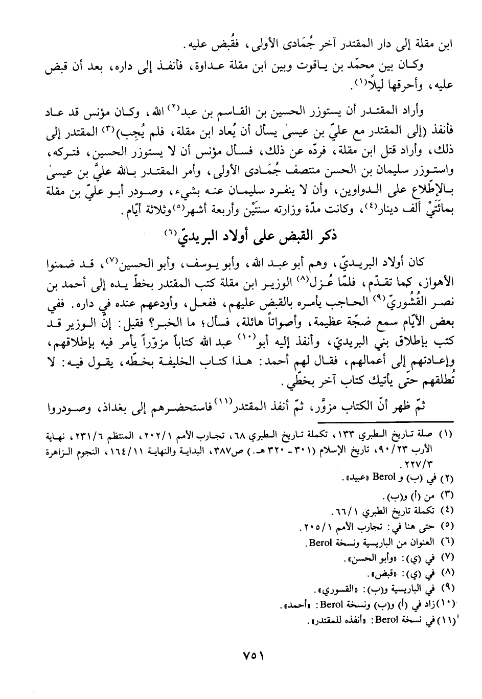 كَانَ أَوْلَادُ الْبَرِيدِيِّ، وَهُمْ أَبُو عَبْدِ اللَّهِ، وَأَبُو يُوسُفَ، وَأَبُو الْحُسَيْنِ، قَدْ ضَمِنُوا الْأَهْوَازَ، كَمَا تَقَدَّمَ، فَلَمَّا عُزِلَ الْوَزِيرُ ابْنُ مُقْلَةَ كَتَبَ الْمُقْتَدِرُ بِخَطِّ يَدِهِ إِلَى أَحْمَدَ بْنِ نَصْرٍ الْقُشُورِيِّ الْحَاجِبِ يَأْمُرُهُ بِالْقَبْضِ عَلَيْهِمْ، فَفَعَلَ، وَأَوْدَعَهُمْ عِنْدَهُ فِي دَارِهِ. فَفِي بَعْضِ الْأَيَّامِ سَمِعَ ضَجَّةً عَظِيمَةً، وَأَصْوَاتًا هَائِلَةً، فَسَأَلَ: مَا الْخَبَرُ؟ فَقِيلَ: إِنَّ الْوَزِيرَ قَدْ كَتَبَ بِإِطْلَاقِ بَنِي الْبَرِيدِيِّ، وَأَنْفَذَ إِلَيْهِ أَبُو عَبْدِ اللَّهِ كِتَابًا مُزَوَّرًا يَأْمُرُهُ فِيهِ بِإِطْلَاقِهِمْ، وَإِعَادَتِهِمْ إِلَى أَعْمَالِهِمْ، فَقَالَ لَهُمْ أَحْمَدُ: هَذَا كِتَابُ الْخَلِيفَةِ بِخَطِّهِ، يَقُولُ فِيهِ: لَا تُطْلِقْهُمْ حَتَّى يَأْتِيَكَ كِتَابٌ آخَرُ بِخَطِّي.