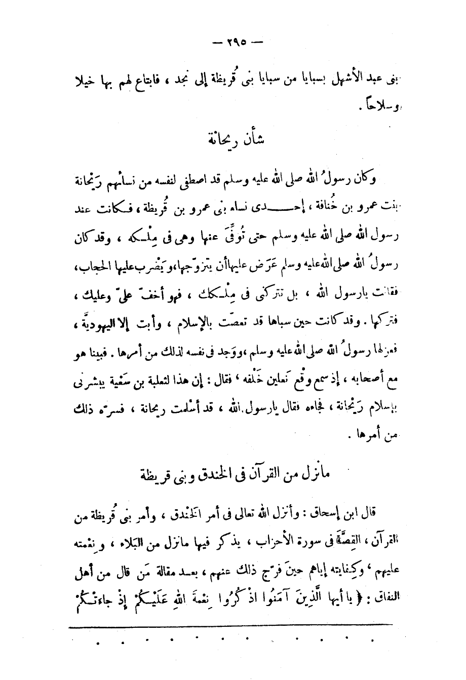 وكان رسول الله صلى الله عليه وسلم قَدْ اصْطَفَى لِنَفْسِهِ مِنْ نِسَائِهِمْ رَيْحَانَةَ بِنْتَ عَمْرِو بْنِ خُنَافَةَ، إحْدَى نِسَاءِ بَنِي عَمْرِو بْنِ قُرَيْظَةَ، فَكَانَتْ عِنْدَ رَسُولِ اللهِ صَلّى اللهُ عَلَيْهِ وَسَلّمَ حَتّى تُوُفّيَ عَنْهَا وَهِيَ فِي مِلْكِهِ، وَقَدْ كَانَ رَسُولُ اللهِ صَلَّى اللَّهُ عَلَيْهِ وَسَلّمَ عَرَضَ عَلَيْهَا أَنْ يَتَزَوّجَهَا، وَيَضْرِبَ عَلَيْهَا الْحِجَابَ، فَقَالَتْ يَا رَسُولَ اللهِ، بَلْ تَتْرُكُنِي فِي مِلْكِك، فَهُوَ أَخَفّ عَلَيّ وَعَلَيْك، فَتَرَكَهَا. وَقَدْ كَانَتْ حِينَ سَبَاهَا قَدْ تَعَصّتْ بِالْإِسْلَامِ، وَأَبَتْ إلّا الْيَهُودِيّةَ، فَعَزَلَهَا رَسُولُ اللهِ صَلّى اللهُ عَلَيْهِ وَسَلّمَ، وَوَجَدَ فِي نَفْسِهِ لِذَلِكَ مِنْ أَمْرِهَا. فَبَيْنَا هُوَ مَعَ أَصْحَابِهِ، إذْ سَمِعَ وَقْعَ نَعْلَيْنِ خَلْفَهُ، فَقَالَ: إنّ هَذَا لِثَعْلَبَةَ بْنِ سَعْيَةَ يُبَشّرُنِي بِإِسْلَامِ رَيْحَانَةَ، فَجَاءَهُ فَقَالَ يَا رَسُولَ اللهِ، قَدْ أَسْلَمَتْ رَيْحَانَةُ، فَسَرّهُ ذَلِكَ مِنْ أَمْرِهَا.