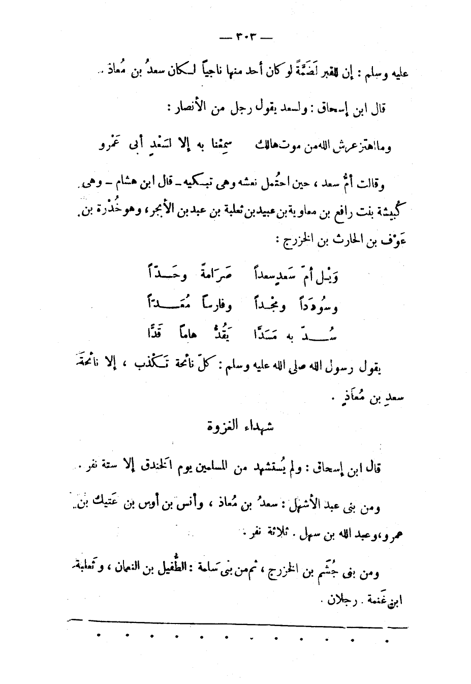 وَقَالَتْ أُمّ سَعْدٍ، حِين اُحْتُمِلَ نَعْشُهُ وَهِيَ تَبْكِيهِ- قَالَ ابْنُ هِشَامٍ- وَهِيَ كُبَيْشَةُ بِنْتُ رَافِعِ بْنِ مُعَاوِيَةَ بْنِ عُبَيْدِ بْنِ ثَعْلَبَةَ بْنِ عَبْدِ بْنِ الْأَبْجَرِ، وَهُوَ خُدْرَةُ بْنُ عَوْفِ بْنِ الْحَارِثِ بْنِ الْخَزْرَجِ:
