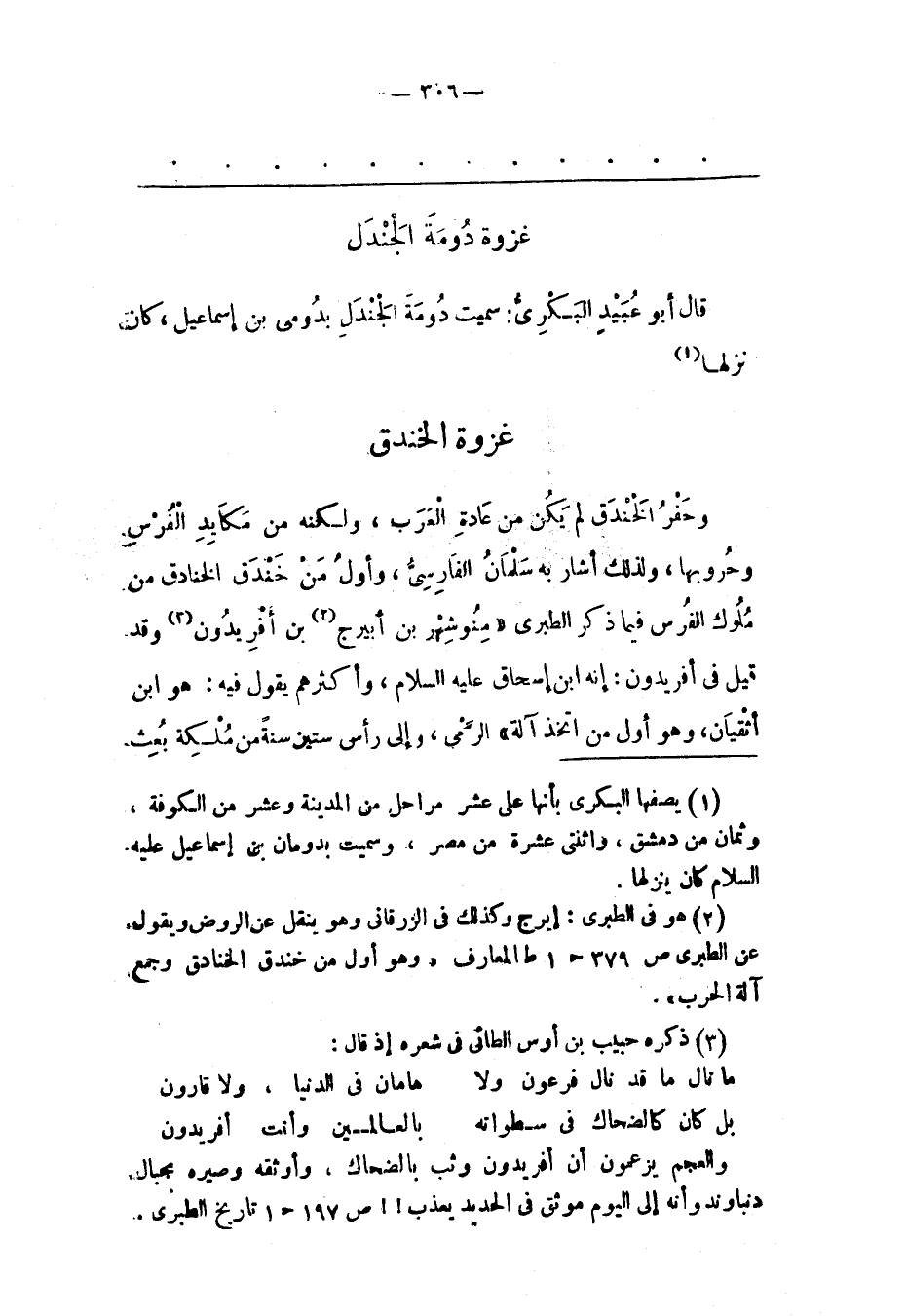 غَزْوَةُ الْخَنْدَقِ وَحَفْرُ الْخَنْدَقِ لَمْ يَكُنْ مِنْ عَادَةِ الْعَرَبِ، وَلَكِنّهُ مِنْ مَكَايِدِ الْفُرْسِ وَحُرُوبِهَا، وَلِذَلِك أَشَارَ بِهِ سَلْمَانُ الْفَارِسِيّ، وَأَوّلُ مَنْ خَنْدَقَ الْخَنَادِقَ مِنْ مُلُوكِ الْفُرْسِ فِيمَا ذَكَرَ الطّبَرِيّ «مِنُوشِهْرُ بْنُ أبيرج «2» بْنُ أَفْرِيدُونَ «3» وَقَدْ قِيلَ فِي أَفْرِيدُونَ: إنّهُ ابْنُ إسْحَاقَ عَلَيْهِ السّلَامُ، وَأَكْثَرُهُمْ يَقُولُ فِيهِ: هُوَ ابْنُ أَثْقِيَانَ، وَهُوَ أَوّلُ مَنْ اتّخَذَ آلَةَ» الرّمْيِ، وَإِلَى رَأْسِ سِتّينَ سَنَةً مِنْ مُلْكِهِ بُعِثَ