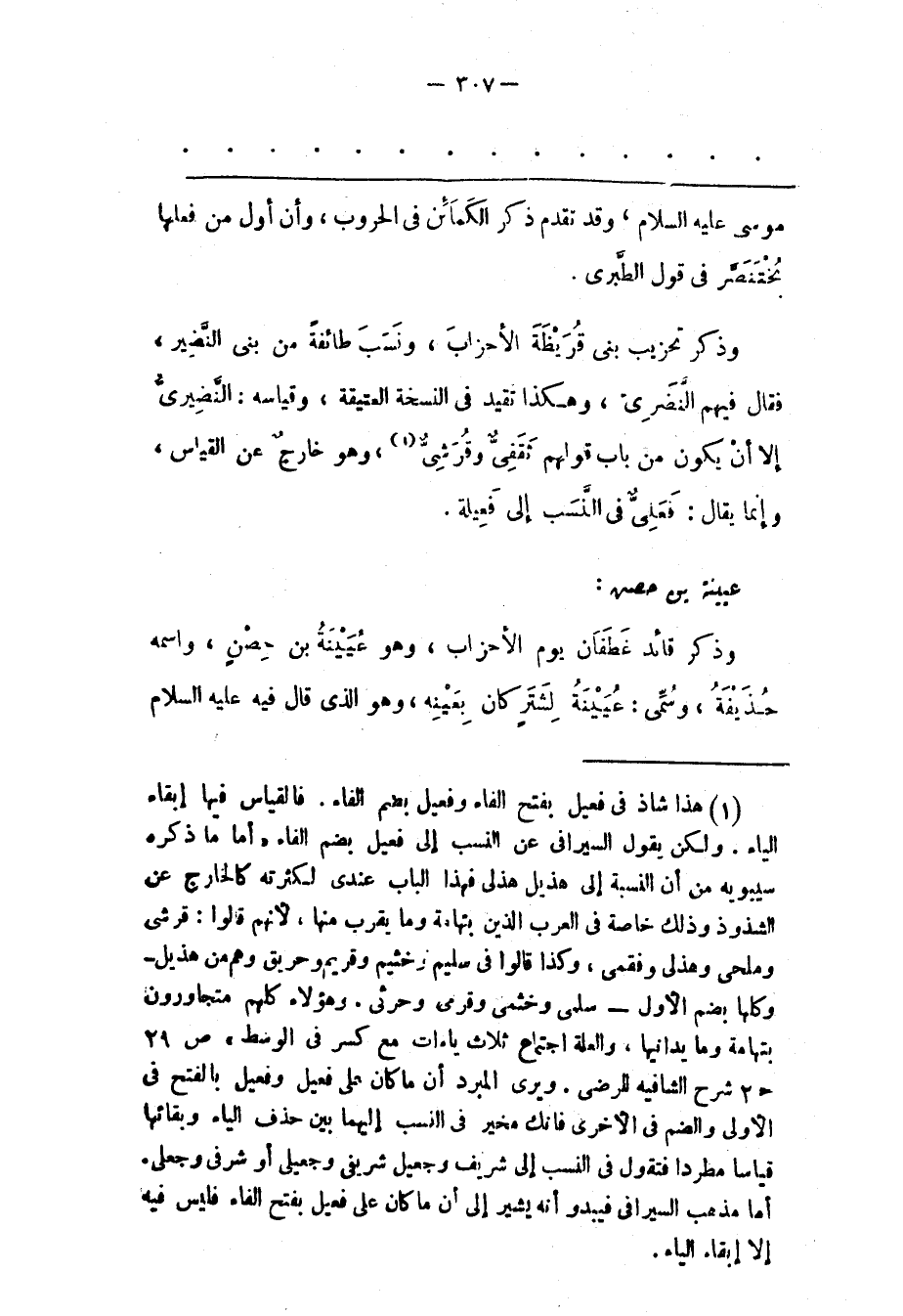 وَذَكَرَ تَحْزِيبَ بَنِي قُرَيْظَةَ الْأَحْزَابَ، وَنَسَبَ طَائِفَةً مِنْ بَنِي النّضِيرِ، فَقَالَ فِيهِمْ النّضَرِيّ، وَهَكَذَا تَقَيّدَ فِي النّسْخَةِ الْعَتِيقَةِ، وَقِيَاسُهُ: النّضِيرِيّ إلّا أَنْ يَكُونَ مِنْ بَابِ قَوْلِهِمْ ثَقَفِيّ وَقُرَشِيّ «1» ، وَهُوَ خَارِجٌ عَنْ الْقِيَاسِ، وإنما يقال: فعلىّ فى النّسب إلى فعلية.