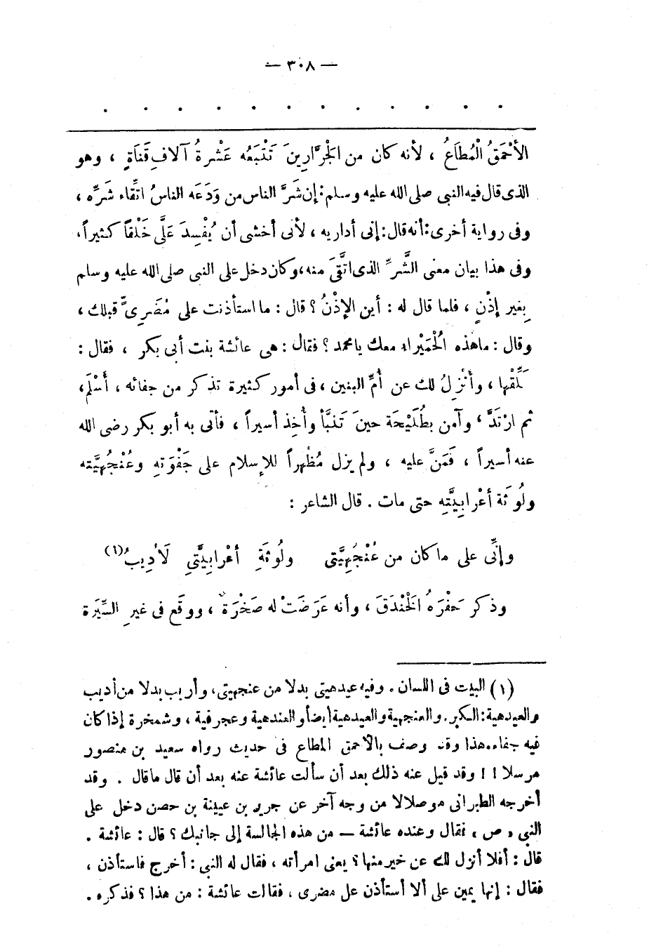 (1) البيت فى اللسان. وفيه عيد هيتى بدلا من عنجهيتى، وأريب بدلا من أديب والعيدهية: الكبر. والعنجهية والعيدهية أيضا والعندهية وعجرفية، وشمخرة إذا كان فيه جفاء. هذا وقد وصف بالأحمق المطاع فى حديث رواه سعيد بن منصور مرسلا!! وقد قيل عنه ذلك بعد أن سألت عائشة عنه بعد أن قال ما قال. وقد أخرجه الطبرانى موصلالا من وجه آخر عن جرير بن عيينة بن حصن دخل على النبى «ص» فقال وعنده عائشة- من هذه الجالسة إلى جانبك؟ قال: عائشة. قال: أفلا أنزل لك عن خير منها؟ يعنى امرأته، فقال له النبى: أخرج فاستأذن، فقال: إنها يمين على ألا استأذن على مضرى، فقالت عائشة: من هذا؟ فذكره-.