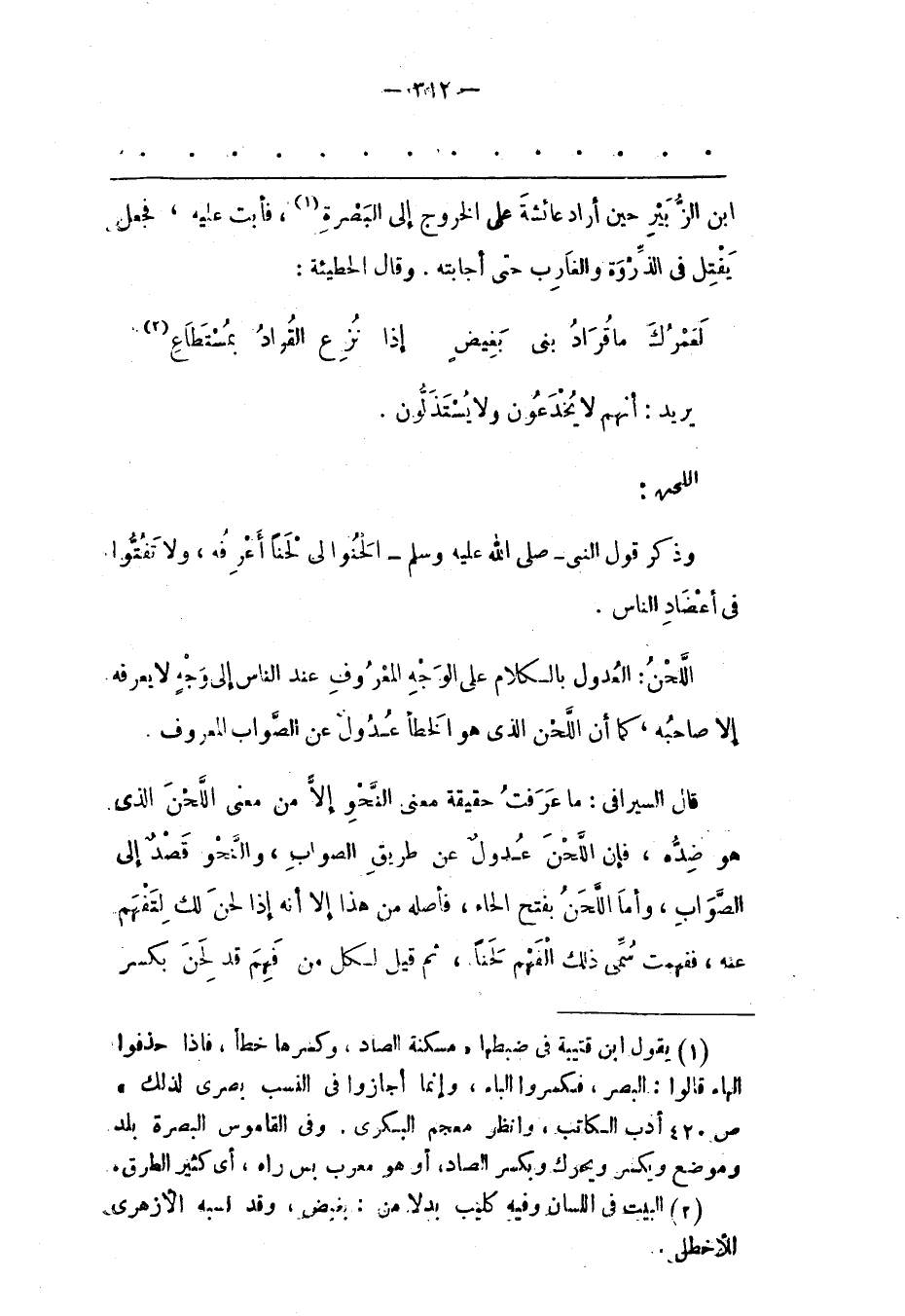 قَالَ السّيرَافِيّ: مَا عَرَفْت حَقِيقَةَ مَعْنَى النّحْوِ إلّا مِنْ مَعْنَى اللّحْنِ الّذِي هُوَ ضِدّهُ، فَإِنّ اللّحْنَ عُدُولٌ عَنْ طَرِيقِ الصّوَابِ، وَالنّحْوُ قَصْدٌ إلَى الصّوَابِ، وَأَمّا اللّحَنُ بِفَتْحِ الْحَاءِ، فَأَصْلُهُ مِنْ هَذَا إلّا أَنّهُ إذَا لَحَنَ لَك لِتَفْهَمَ عَنْهُ، فَفَهِمْت سُمّيَ ذَلِكَ الْفَهْمُ لَحَنًا، ثُمّ قِيلَ لِكُلّ مَنْ فَهِمَ قَدْ لَحِنَ بكسر