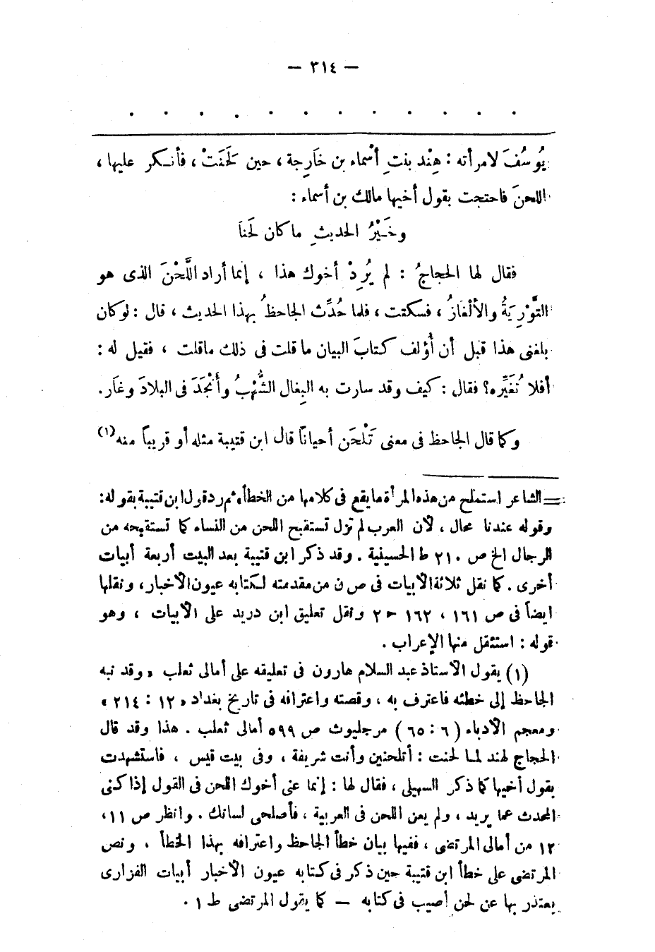 (1) يقول الأستاذ عبد السلام هارون فى تعليقه على أمالى ثعلب «وقد نبه الجاحظ إلى خطئه فاعترف به، وقصته واعترافه فى تاريخ بغداد «12: 214» ومعجم الأدباء (6: 65) مرجليوث ص 599 أمالى ثعلب. هذا وقد قال الحجاج لهند لما لحنت: أتلحنين وأنت شريفة، وفى بيت قيس، فاستشهدت بقول أخيها كما ذكر السهيلى، فقال لها: إنما عنى أخوك اللحن فى القول إذا كنى المحدث عما يريد، ولم يعن اللحن فى العربية، فأصلحى لسانك. وانظر ص 11، 12 من أمالى المرتضى، ففيها بيان خطأ الجاحظ واعترافه بهذا الخطأ، ونص المرتضى على خطأ ابن قتيبة حين ذكر فى كتابه عيون الأخبار أبيات الفزارى يعتذر بها عن لحن أصيب فى كتابه- كما يقول المرتضى ط 1.