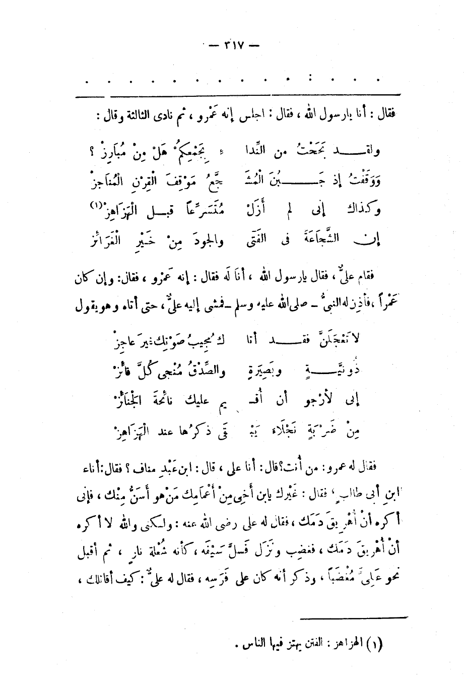 فَقَالَ لَهُ عَمْرٌو: مَنْ أَنْتَ؟ قَالَ: أَنَا على، قال: ابن عبد مناف؟ فقال: أناء ابن أبى طالب، فقال: غيرك يابن أَخِي مِنْ أَعْمَامِك مَنْ هُوَ أَسَنّ مِنْك، فَإِنّي أَكْرَهُ أَنْ أُهْرِيقَ دَمَك، فَقَالَ لَهُ عَلِيّ رَضِيَ اللهُ عَنْهُ: وَلَكِنّي وَاَللهِ لَا أَكْرَهُ أَنْ أُهْرِيقَ دَمَك، فَغَضِبَ وَنَزَلَ فَسَلّ سَيْفَهُ، كَأَنّهُ شُعْلَةُ نَارٍ، ثُمّ أَقْبَلَ نَحْوَ عَلِيّ مُغْضَبًا، وَذَكَرَ أَنّهُ كَانَ عَلَى فَرَسِهِ، فقال له علىّ: كيف أقاتلك،