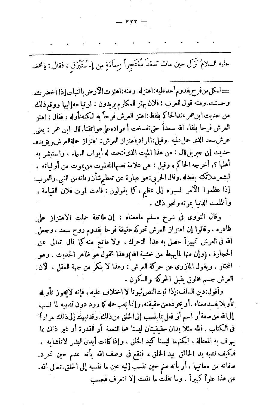 - لكل من فرح بقدوم أحد عليه: اهتز له، ومنه: اهتزت الأرض بالنبات إذا اخضرت وحسنت. ومنه قول العرب: فلان يهتز للمكارم يريدون: ارتياحه إليها ووقع ذلك من حديث ابن عمر عند الحاكم بلفظ: اهتز العرش فرحا به لكنه تأوله، فقال: اهتز العرش فرحا بلقاء الله سعدا حتى تفسخت أعواده على عواتقنا. قال ابن عمر: يعنى عرش سعد الذى حمل عليه. وقيل: المراد باهتزاز العرش: اهتزاز حملة العرش ويؤيده حديث إن جبريل قال: من هذا الميت الذى فتحت له أبواب السماء، واستبشر به أهلها؟ «أخرجه الحاكم» وقيل: هى علامة نصبها الله لموت من يموت من أوليائه، ليشعر ملائكته بفضله. وقال الحربى: هو عبارة عن تعظيم شأن وفاته من النبى، والعرب إذا عظموا الأمر نسبوه إلى عظيم، كما يقولون: قامت لموت فلان القيامة، وأظلمت الدنيا بموته ونحو ذلك. وقال النووى فى شرح مسلم ما معناه: إن طائفة حملت الاهتزاز على ظاهره، وقالوا إن اهتزاز العرش تحركه حقيقة فرحا بقدوم روح سعد، وجعل الله فى العرش تمييزا حصل به هذا التحرك، ولا مانع منه كما قال تعالى عن الحجارة، (وإن منها لما يهبط من خشية الله) وهذا القول هو ظاهر الحديث، وهو المختار. ويقول المازرى عن حركة العرش: وهذا لا ينكر من جهة العقل، لأن العرش جسم مخلوق يقبل الحركة والسكون. وأقول: دين السلف: إذا ثبت النص ثبوتا لا اختلاف عليه، فإنه لا يجوز تأويله تأويلا يفسد معناه، أو يجرده من حقيقته، وإنما يجب حمله كما ورد دون تشبيه لما نسب إلى الله من صفة أو اسم أو فعل بما ينسب إلى الخلق من ذلك. وقد نبهت إلى ذلك مرارا فى الكتاب. فلله مثلا يدان حقيقتان ليستا هما النعمة أو القدرة أو غير ذلك مما يهرف به المعطلة، لكنهما ليستا كيد الخلق، وإذا كانت أيدى البشر لا تتشابه، فكيف نشبه يد الخالق بيد الخلق، فنقع فى وصف الله بأنه عدم حين تجرد صفاته من معانيها، أر بأنه صنم حين ننسب إليه عين ما ننسبه إلى الخلق، تعالى الله عن هذا علوا كبيرا. وما نقلت ما نقلت إلا لتعرف فحسب.