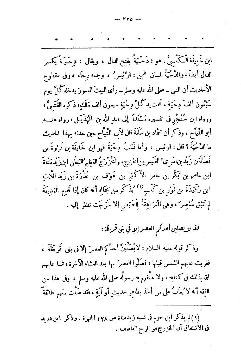 ابن خَلِيفَةَ الْكَلْبِيّ. هُوَ: دِحْيَةُ بِفَتْحِ الدّالِ، وَيُقَالُ: دِحْيَةُ بِكَسْرِ الدّالِ أَيْضًا، وَالدّحْيَةُ بِلِسَانِ الْيَمَنِ: الرّئِيسُ، وَجَمْعُهُ دِحَاءٌ، وَفِي مَقْطُوعِ الْأَحَادِيثِ أَنّ النّبِيّ- صَلَّى اللَّهُ عَلَيْهِ وَسَلَّمَ- رَأَى الْبَيْتَ الْمَعْمُورِ يَدْخُلُهُ كُلّ يَوْمٍ سَبْعُونَ أَلْفَ دحية، تَحْتَ يَدِ كُلّ دِحْيَةٍ سَبْعُونَ أَلْفَ مَلَكٍ، ذَكَرَهُ الْقُتَبِيّ، وَرَوَاهُ ابْنُ سُنْجُرٍ فِي تَفْسِيرِهِ مُسْنَدًا إلَى عَبْدِ اللهِ بْنِ الْهُذَيْلِ، رَوَاهُ عَنْهُ أَبُو التّيّاحِ، وَذَكَرَ أَنّ حَمّادَ بْنَ سَلَمَةَ قَالَ لِأَبِي التّيّاحِ حِينَ حَدّثَهُ بِهَذَا الْحَدِيثِ مَا الدّحْيَةُ؟ قَالَ: الرّئِيسُ، وَأَمّا نَسَبُ دِحْيَةَ فَهُوَ ابْنُ خَلِيفَةَ بْنِ فَرْوَةَ بْنِ فَضَالَةَ بْنِ زَيْدِ بْنِ امْرِئِ الْقَيْسِ بْنِ الْخَزْرَجِ، وَالْخَزْرَجُ الْعَظِيمُ الْبَطْنِ ابْنُ زَيْدِ مَنَاةَ ابن عَامِرِ بْنِ بَكْرِ بْنِ عَامِرِ الْأَكْبَرِ بْنِ عوف بن عذرة بن زيد اللّات ابن رُقَيْدَةَ بْنِ ثَوْرِ بْنِ كَلْبٍ «1» يُذْكَرُ مِنْ جَمَالِهِ أَنّهُ كَانَ إذَا قَدِمَ الْمَدِينَةَ لَمْ تَبْقَ مُعْصِرٌ، وَهِيَ الْمُرَاهِقَةُ لِلْحَيْضِ إلّا خَرَجَتْ تَنْظُرُ إلَيْهِ.