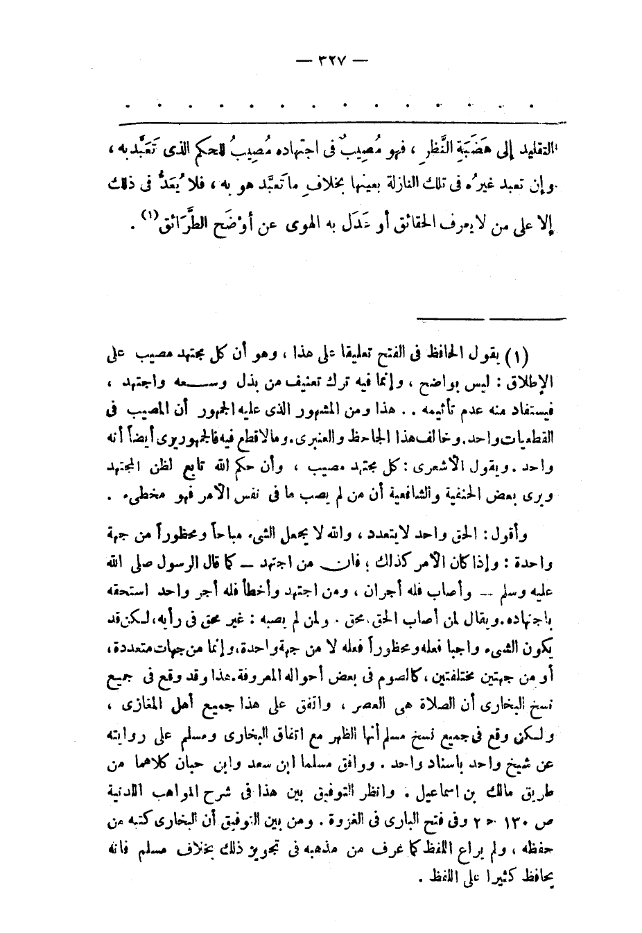 التّقْلِيدِ إلَى هَضْبَةِ النّظَرِ، فَهُوَ مُصِيبٌ فِي اجْتِهَادِهِ مُصِيبٌ لِلْحُكْمِ الّذِي تَعَبّدَ بِهِ، وَإِنْ تَعَبّدَ غَيْرُهُ فِي تِلْكَ النّازِلَةِ بِعَيْنِهَا بِخِلَافِ مَا تَعَبّدَ هُوَ بِهِ، فَلَا يُعَدّ فِي ذَلِكَ إلّا عَلَى مَنْ لَا يَعْرِفُ الْحَقَائِقَ أَوْ عَدَلَ بِهِ الْهَوَى عن أوضح الطرائق «1» .