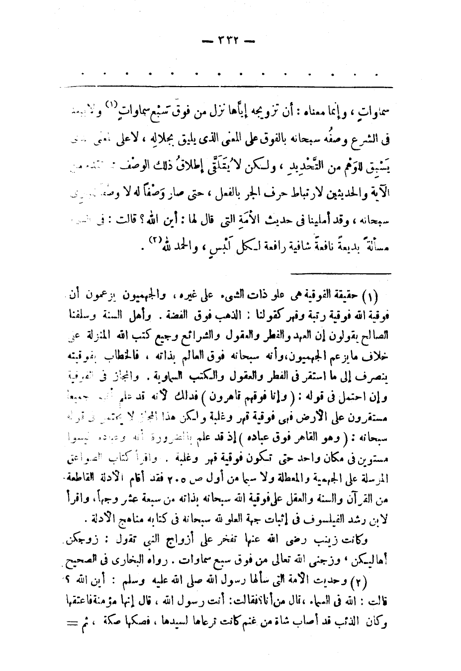 (1) حقيقة الفوقية هى علو ذات الشىء على غيره، والجهميون يزعمون أن فوقية الله فوقية رتبة وقهر كقولنا: الذهب فوق الفضة. وأهل السنة وسلفنا الصالح يقولون إن العهد والفطر والعقول والشرائع وجميع كتب الله المنزلة على خلاف ما يزعم الجهميون، وأنه سبحانه فوق العالم بذاته، فالخطاب بفوقيته ينصرف إلى ما استقر فى الفطر والعقول والكتب السماوية. والمجاز فى الفوقية وإن احتمل فى قوله: (وَإِنَّا فَوْقَهُمْ قاهِرُونَ) فدلك لأنه قد علم أنهم جميعا مستقرون على الأرض فهى فوقية قهر وغلبة ولكن هذا المجاز لا يحتمل فى قوله سبحانه: (وَهُوَ الْقاهِرُ فَوْقَ عِبادِهِ) إذ قد علم بالضرورة أنه وعباد. ليسوا مستوين فى مكان واحد حتى تكون فوقية قهر وغلبة. واقرأ كتاب الصواعق المرسلة على الجهمية والمعطلة ولا سيما من أول ص 205 فقد أقام الأدلة القاطعة من القرآن والسنة والعقل على فوقية الله سبحانه بذاته من سبعة عشر وجها، واقرأ لابن رشد الفيلسوف فى إثبات جهة العلو لله سبحانه فى كتابه مناهج الأدلة. وكانت زينب رضى الله عنها تفخر على أزواج النبى تقول: زوجكن أهاليكن، وزجنى الله تعالى من فوق سبع سماوات. رواه البخارى فى الصحيح.