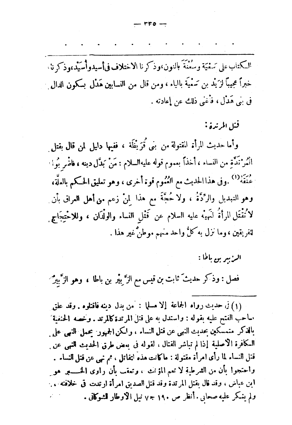 وَأَمّا حَدِيثُ الْمَرْأَةِ الْمَقْتُولَةِ مِنْ بَنِي قُرَيْظَةَ، فَفِيهَا دَلِيلٌ لِمَنْ قَالَ بِقَتْلِ الْمُرْتَدّةِ مِنْ النّسَاءِ، أَخْذًا بِعُمُومِ قَوْلِهِ عَلَيْهِ السّلَامُ: مَنْ بَدّلَ دِينَهُ، فَاضْرِبُوا عُنُقَهُ «1» . وَفِي هَذَا الْحَدِيثِ مَعَ الْعُمُومِ قُوّةٌ أُخْرَى، وَهُوَ تَعْلِيقُ الْحُكْمِ بِالْعِلّةِ، وَهُوَ التّبْدِيلُ وَالرّدّةُ، وَلَا حُجّةَ مَعَ هَذَا لِمَنْ زعم منى أَهْلِ الْعِرَاق بِأَنْ لَا تُقْتَلَ الْمَرْأَةُ لِنَهْيِهِ عَلَيْهِ السّلَامُ عَنْ قَتْلِ النّسَاءِ وَالْوِلْدَانِ، وَلِلِاحْتِجَاجِ لِلْفَرِيقَيْنِ، وَمَا نَزَلَ بِهِ كُلّ وَاحِدٍ مِنْهُمْ مَوْطِنٌ غَيْرُ هَذَا.