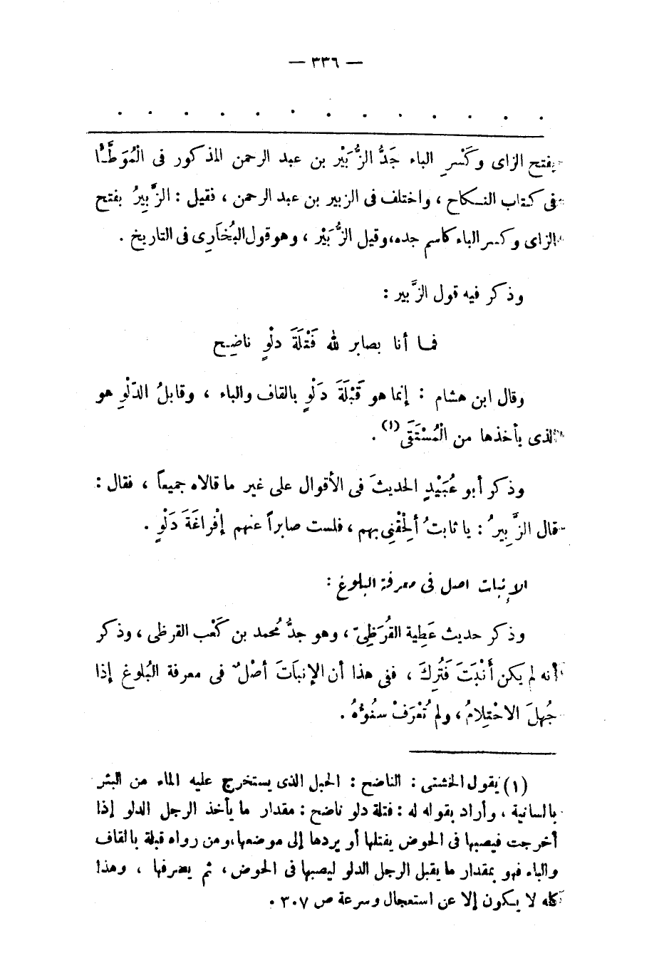 (1) يقول الخشنى: الناضح: الحبل الذى يستخرج عليه الماء من البئر بالسانية، وأراد بقوله له: فتلة دلو ناضح: مقدار ما يأخذ الرجل الدلو إذا أخرجت فيصبها فى الحوض يفتلها أو يردها إلى موضعها، ومن رواه قبلة بالقاف والباء فهو بمقدار ما يقبل الرجل الدلو ليصبها فى الحوض، ثم يصرفها، وهذا كله لا يكون إلا عن استعجال وسرعة ص 307.