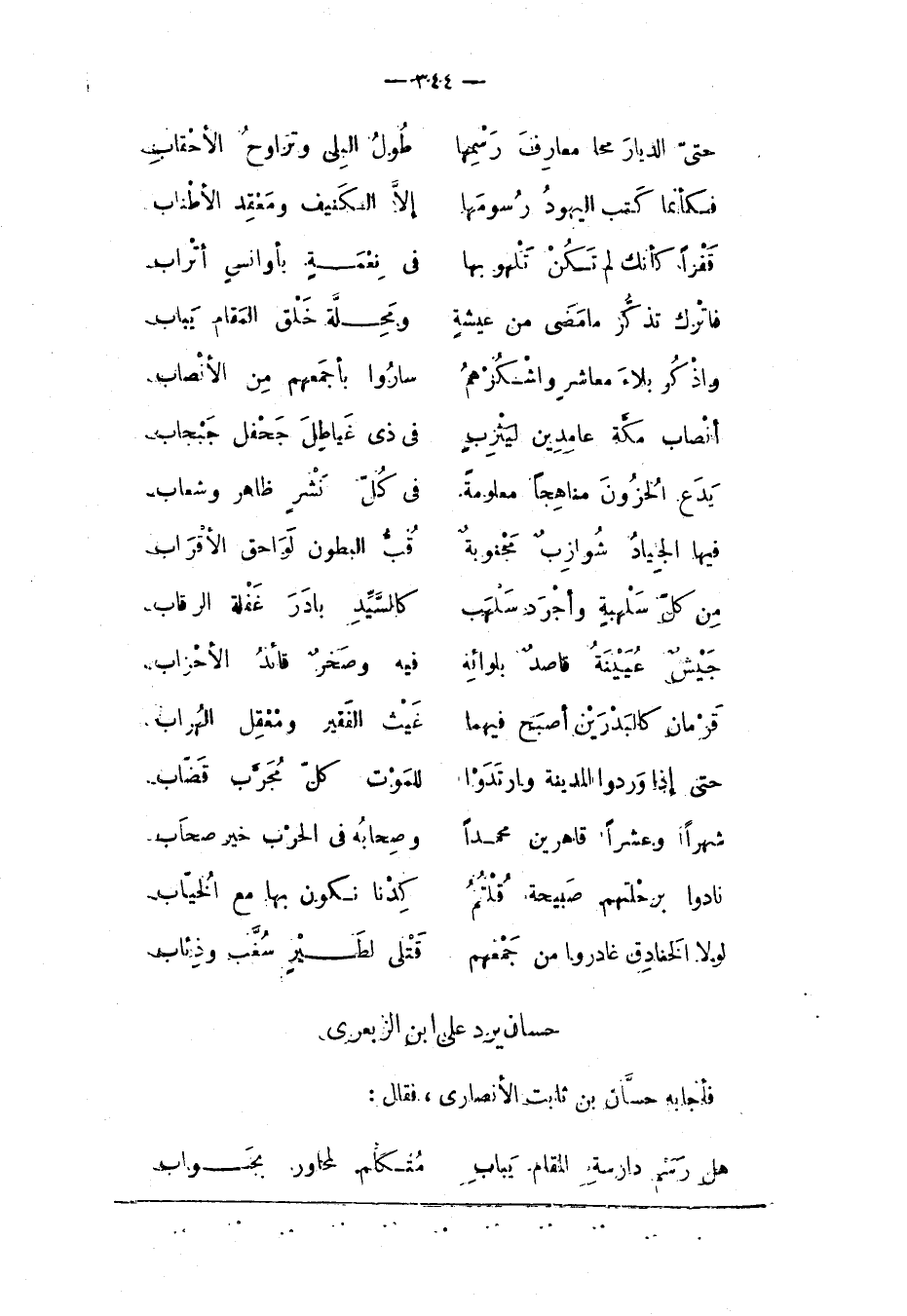حسان يرد عَلَى ابْنِ الزّبَعْرَى فَأَجَابَهُ حَسّانُ بْنُ ثَابِتٍ الأنصارى، فقال: